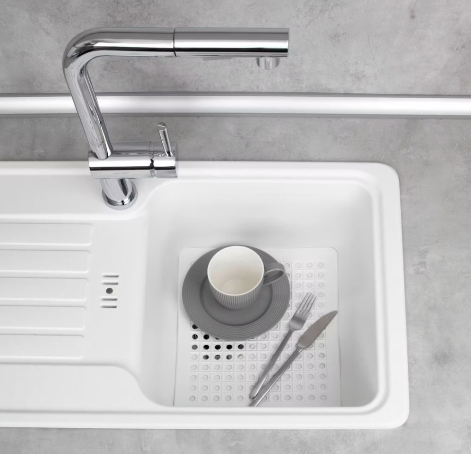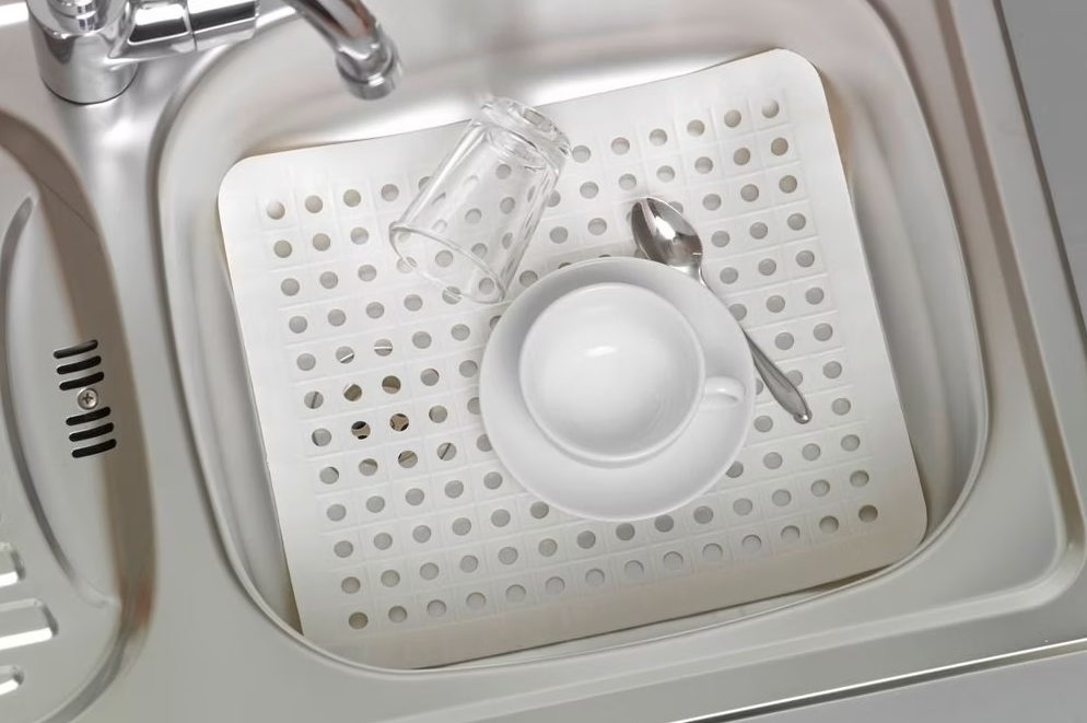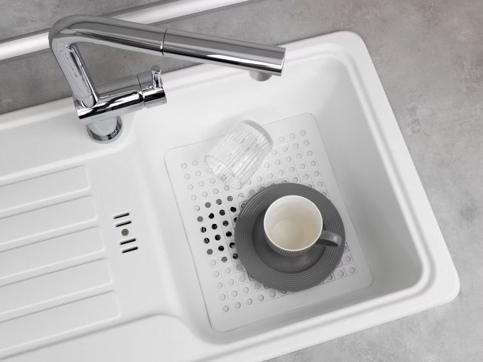 Dankzij het stevige, witte kunststof voorkomt de gootsteenmat krassen op het oppervlak van de spoelbak en zorgt het ervoor dat uw breekbare vaatwerk veilig blijft liggen. Daarnaast is de mat ook geschikt voor het tijdelijk bewaren of afgieten van uw afgewassen servies.