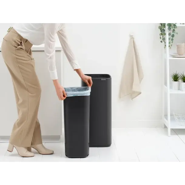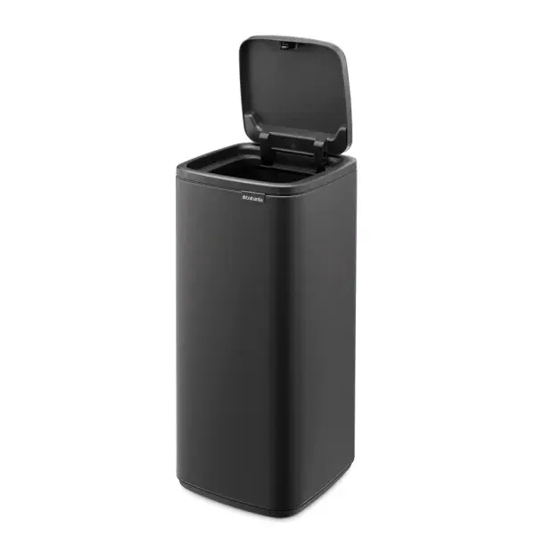 De Brabantia Bo Touch Bin 30 liter in de kleur Mineral Infinite Grey is een stijlvolle en praktische afvalbak die perfect past in een moderne keuken of kantoorruimte. Dankzij het rechthoekige, ruimtebesparende ontwerp staat de prullenbak strak tegen de muur en past hij ook netjes in een hoek.