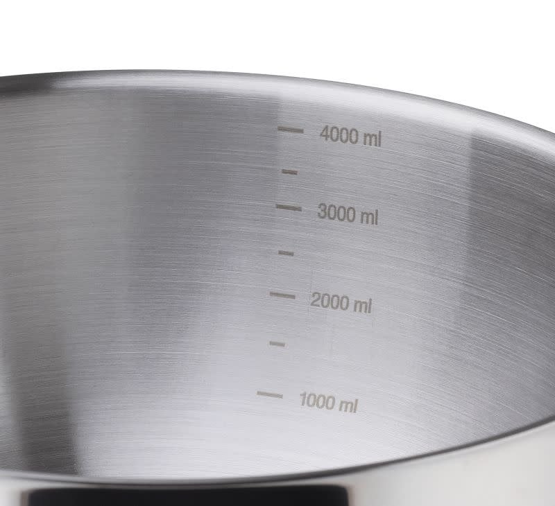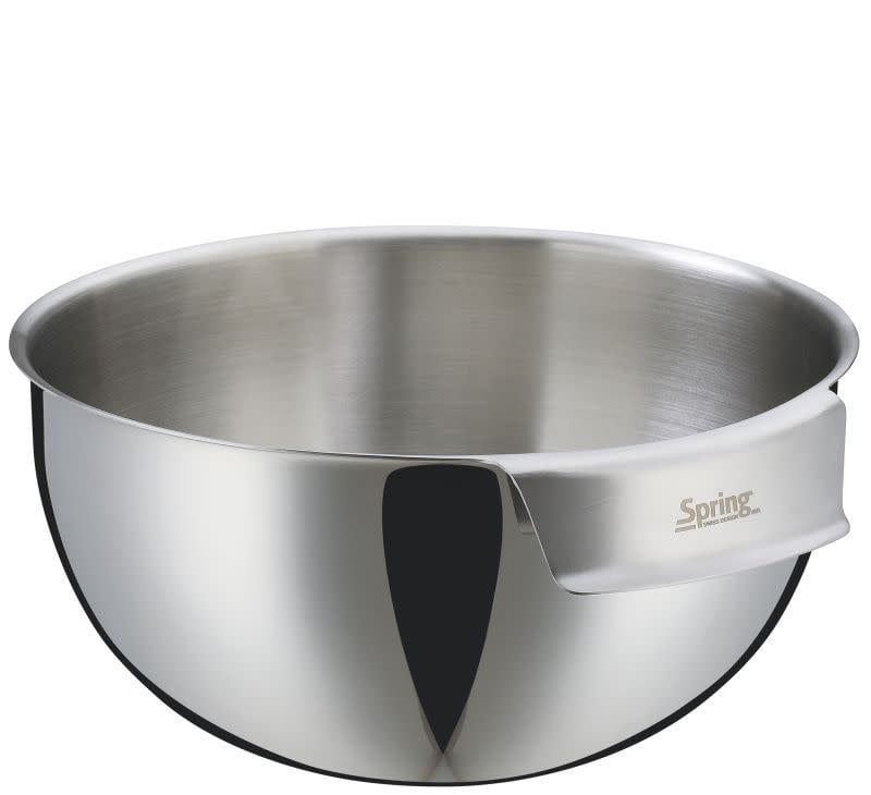 De beslagkom met handvat 25 cm van Spring is gemaakt van hoogwaardig roestvrij staal en heeft een inhoud van 4,4 liter. Dankzij de handige zijhandgreep, interne maatschaal en afgeplatte bodem biedt de kom optimale stabiliteit en gebruiksgemak bij mixen, roeren en kneden. Het hitte- en koudebestendige materiaal is duurzaam, hygiënisch en eenvoudig te reinigen in de vaatwasser.
