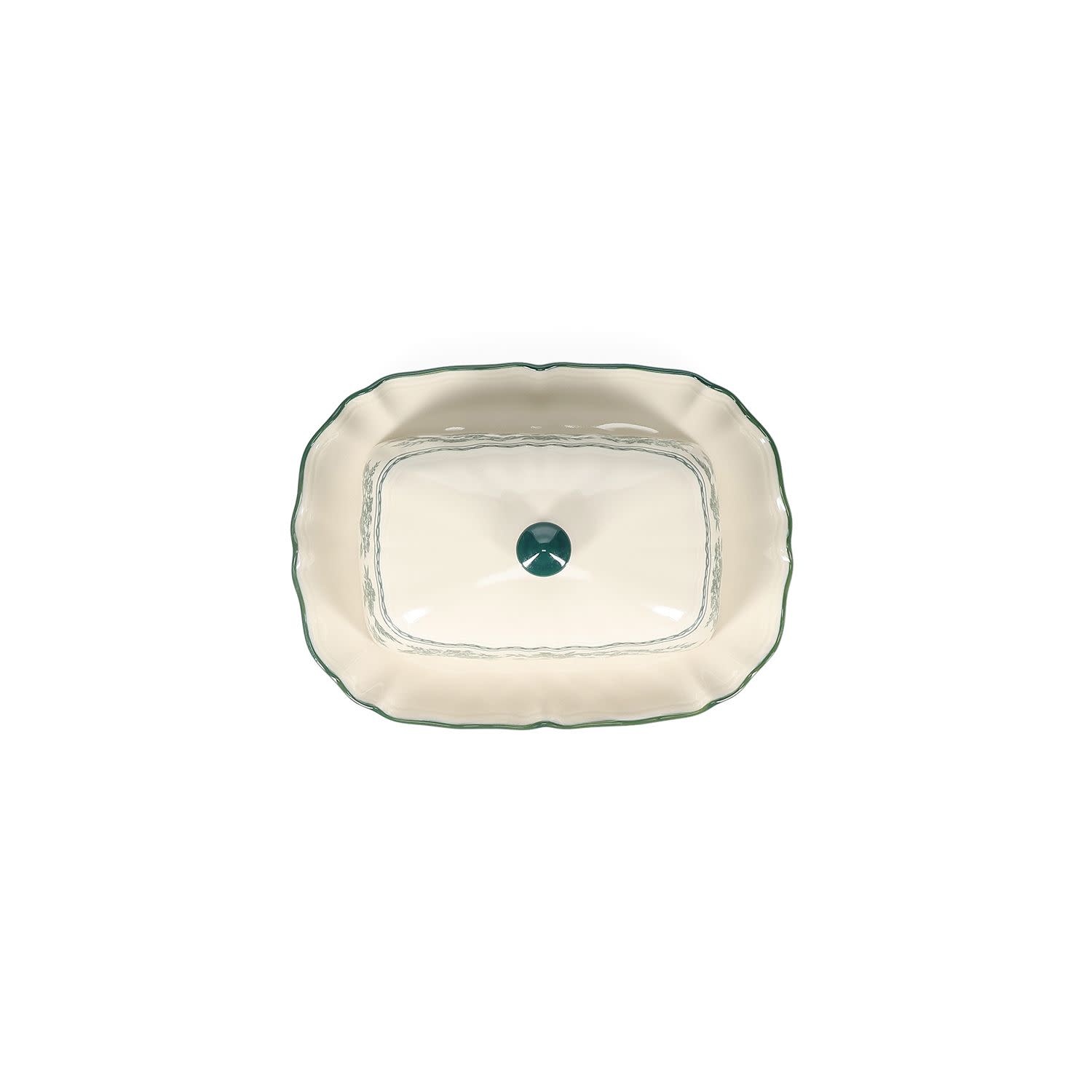 De botervloot uit de Cyril collectie heeft een afmeting van 20 x 14,5 x 8,5 cm en is uitgevoerd in een groene kleur met ivoorkleurige accenten. Het ontwerp is rechthoekig en gemaakt van verfijnd porselein met een niet reactieve glazuurafwerking en subtiel patroon.