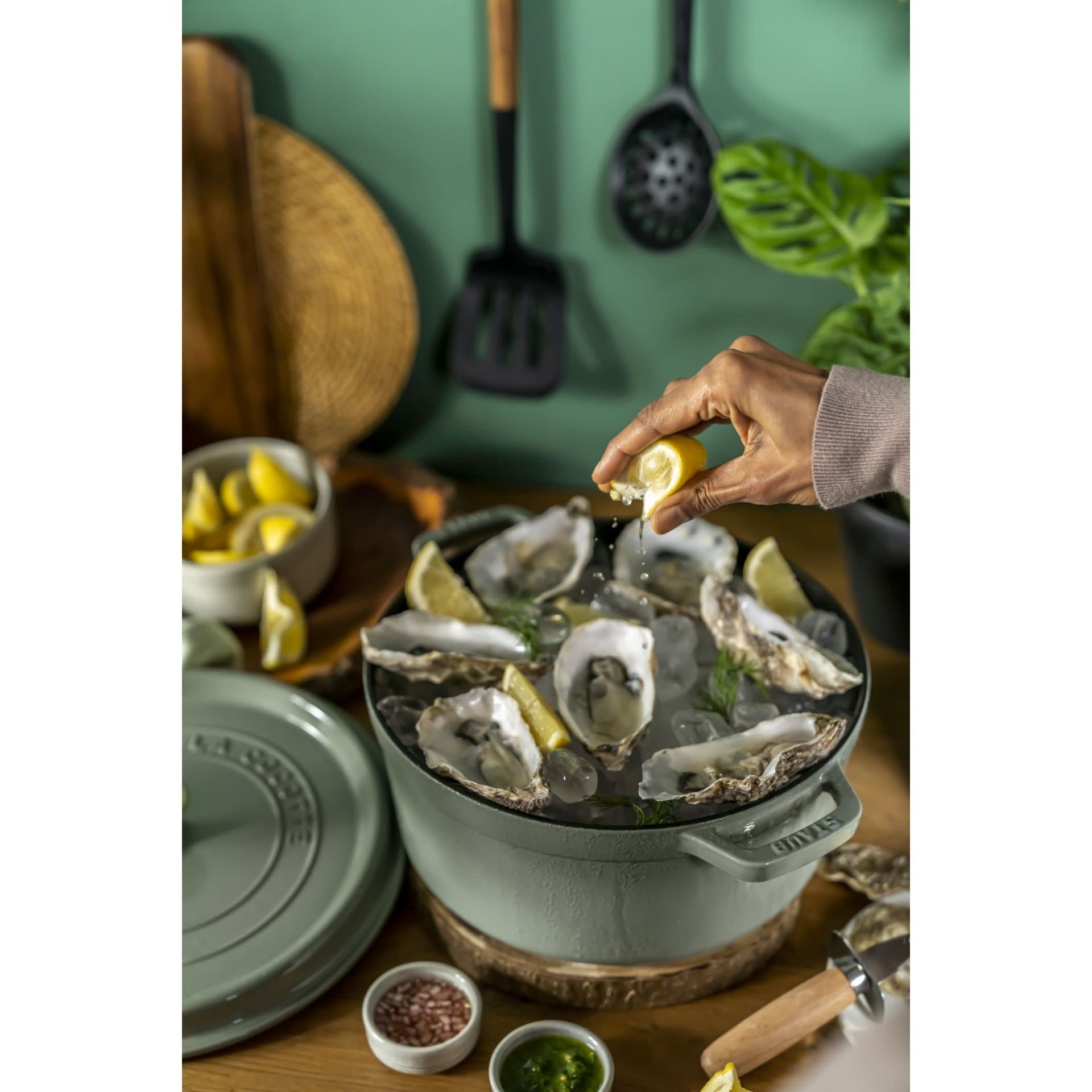 Traag gegaarde gerechten zijn helemaal in en jonge koks willen deze kunst net zo graag beheersen als ervaren chefs. De unieke smaken van 'slow-cooked' vlees en groenten ontwikkelen zich optimaal in een braadpan, zoals deze ronde zwarte cocotte van Staub. Hij heeft niet alleen een mooi, eenvoudig design, maar bestaat ook uitzonderlijke materialen. Met haar diameter van 28 cm is deze braadpan de ideale keukenpartner voor kleine gezinnen of singles. De cocotte heeft een inhoud van 6,7 l en is perfect om een kleinere hoeveelheid groenten, vis of vlees te bereiden. Aan de binnenzijde is de cocotte afgewerkt met matzwart email om het voedsel perfect dicht te schroeien en de natuurlijke smaken in de ingrediënten te verzegelen. De eigenschappen van het materiaal worden alleen maar beter naarmate u de pot vaker gebruikt. Natuurlijk is de Staub cocotte geschikt voor alle kookoppervlakken. Dankzij de combinatie van gietijzer en email wordt de warmte perfect verspreid in de cocotte. Gietijzer is snel en gemakkelijk te reinigen en tegelijk uiterst slijtvast. Ontdek zelf hoe praktisch de Staub cocotte is en creëer moeiteloos hemelse stoofschotels in uw eigen keuken.