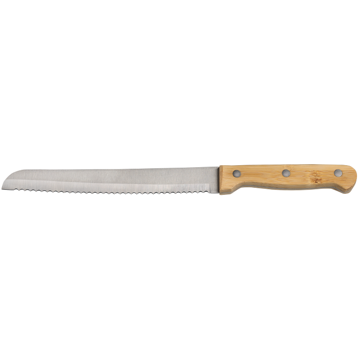 De handgreep is vervaardigd uit duurzaam bamboe en biedt een comfortabele, stevige grip. Dankzij het lichte gewicht en de ergonomische vorm ligt het mes prettig in de hand, wat zorgt voor optimale controle tijdens het snijden. Met een totale lengte van circa 21,7 cm is dit broodmes perfect geschikt voor dagelijks gebruik in de keuken.