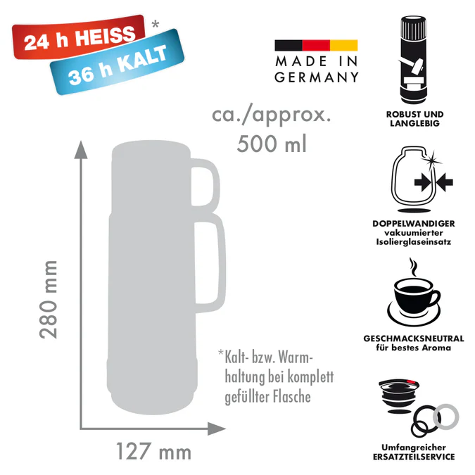 De zilvergrijze isoleerfles van Rotpunkt met een inhoud van 0,5 liter heeft een strak design en betrouwbare isolatie. Dankzij de slanke vorm is hij eenvoudig met één hand te gebruiken en ideaal voor dagelijks gebruik, thuis of onderweg. Met een capaciteit van circa 0,5 liter is de fles goed voor ongeveer 2 tot 3 kopjes koffie of thee en geschikt voor 1 tot 2 personen.