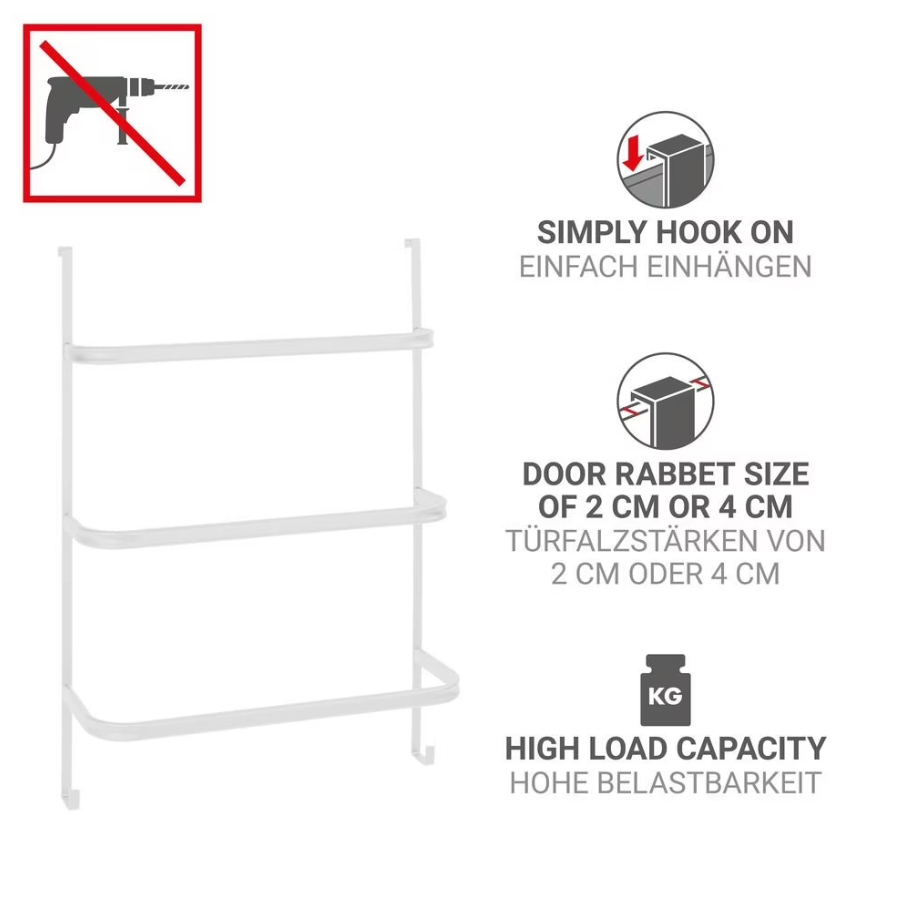 Dankzij de flexibele bevestiging is deze handdoekhouder geschikt voor deuren met een sponningdikte van zowel 2 cm als 4 cm. U hangt hem eenvoudig op, waar u maar wilt. Ideaal voor wie op zoek is naar een snelle, praktische én esthetische oplossing.