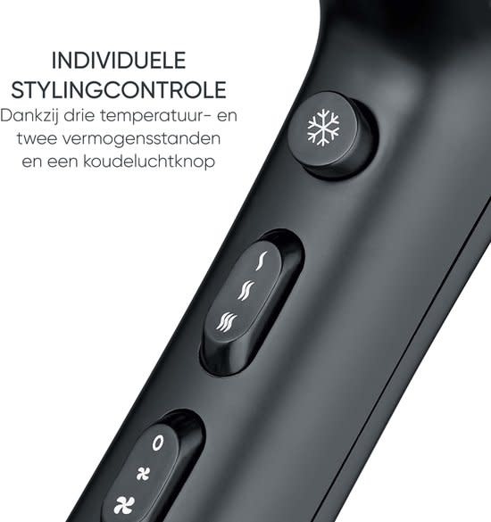 De haardroger wordt geleverd met een nauwkeurige concentrator en een diffuser voor meer volume en pluisvrije krullen. De coolshot-functie fixeert je kapsel voor een langdurige look. Dankzij het afneembare luchtinlaatrooster is de stylingtool eenvoudig te reinigen en blijft hij optimaal presteren. Een roterend snoer en ophanglus maken het gebruik nog comfortabeler.