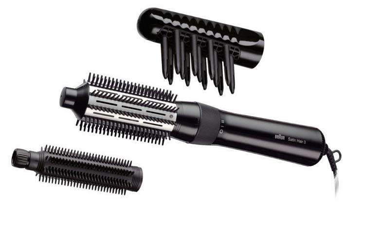 Föhnborstel Satin Hair 3 Airstyler van Braun biedt drogen en stylen in één apparaat. Het wordt geleverd met twee borstels: een Maxi-Curl van 38 mm voor grote golven en een borstel van 23 mm voor kleinere krullen. Het volume-opzetstuk droogt het haar bij de wortels en geeft extra volume. De borstel heeft twee luchtstroom- en temperatuurstanden, een automatische afwikkelfunctie en werkt op 230 volt met een vermogen van 400 watt.