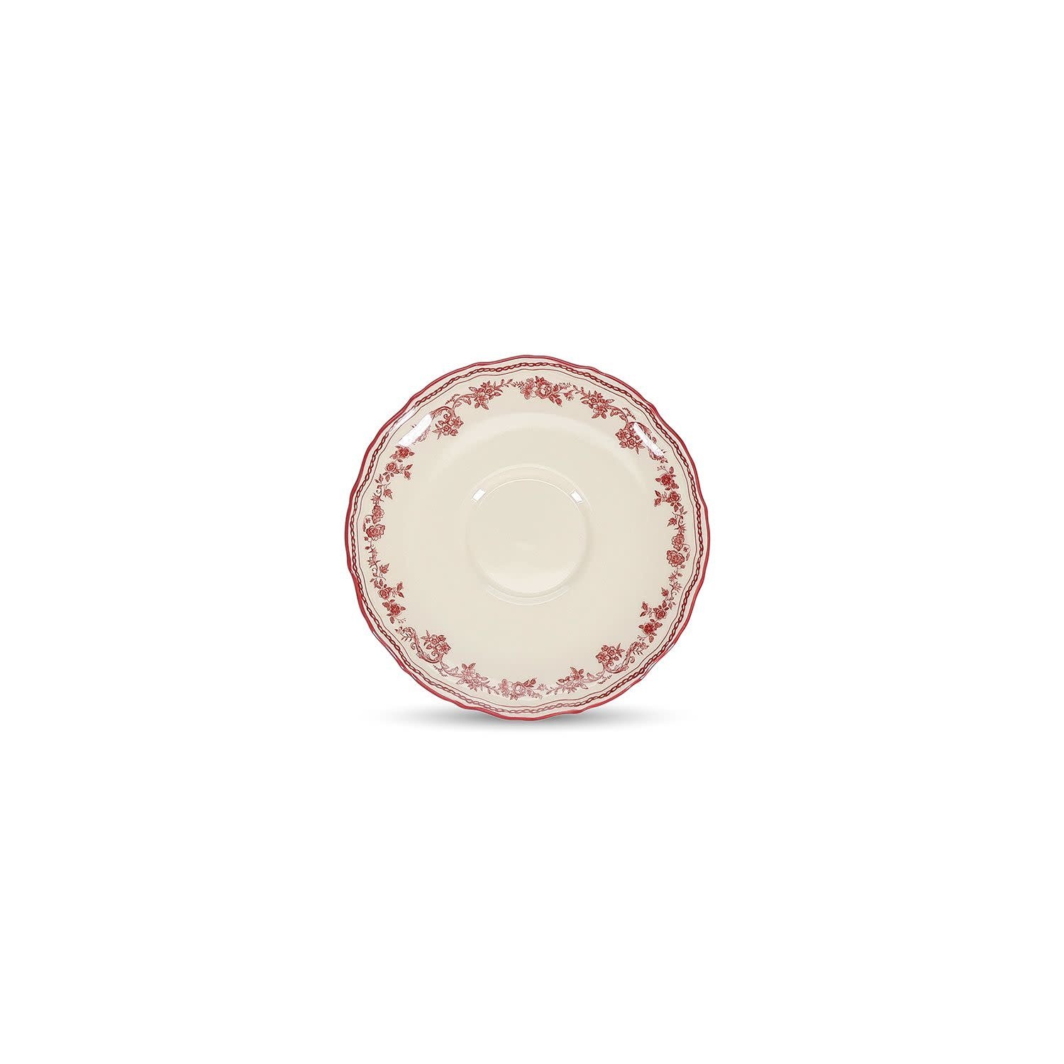 De schotel uit de Cyril collectie heeft een diameter van 15,5 cm en is uitgevoerd in bordeauxrood met ivoorkleurige accenten. Het ronde ontwerp is vervaardigd uit porselein en afgewerkt met een niet reactieve glazuurlaag met subtiel patroon.