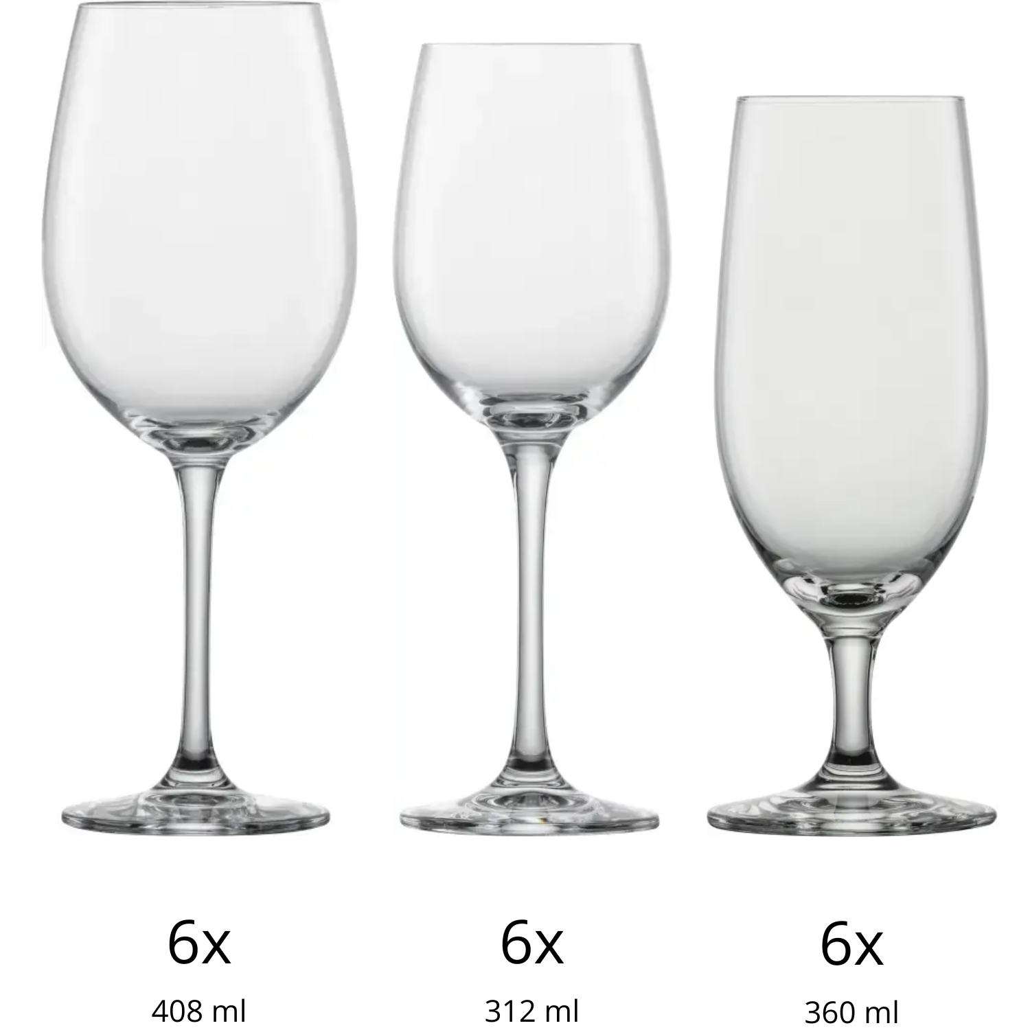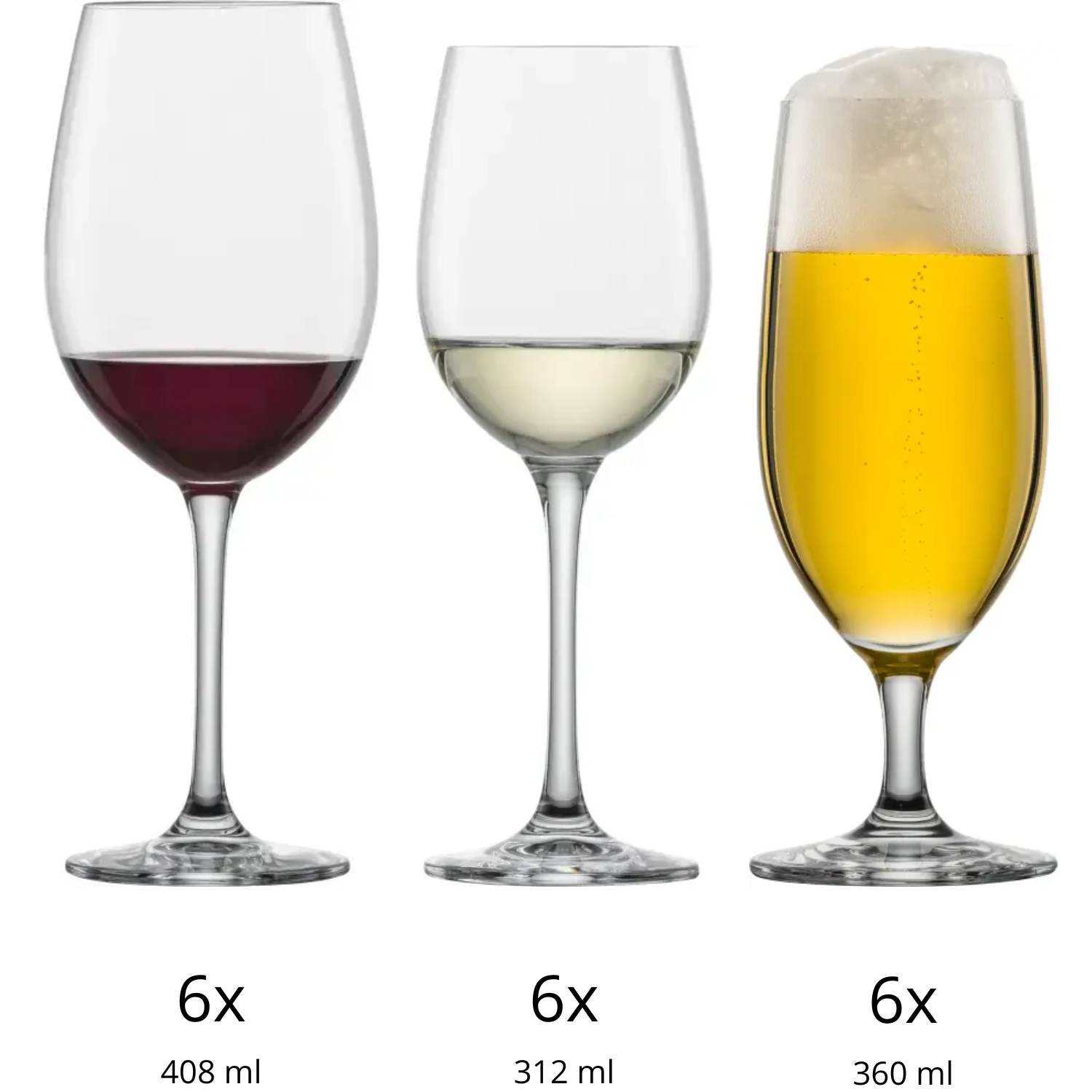 Deze 18-delige glazenset uit de Classico serie van Schott Zwiesel bestaat uit zes rode wijnglazen, zes witte wijnglazen en zes bierglazen. Door de combinatie is de set geschikt voor verschillende dranken en gelegenheden, zowel thuis als bij etentjes of feestjes.