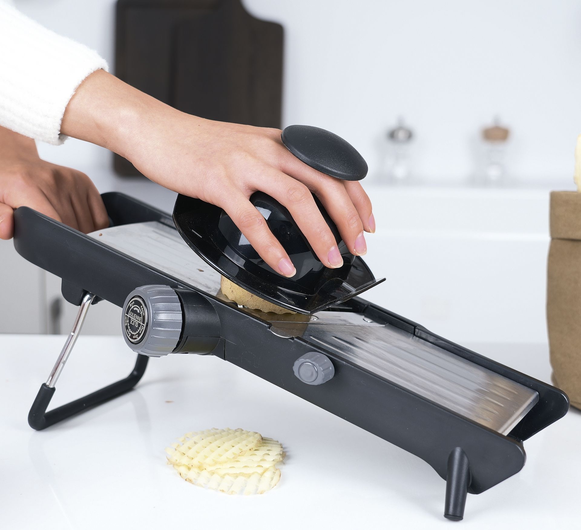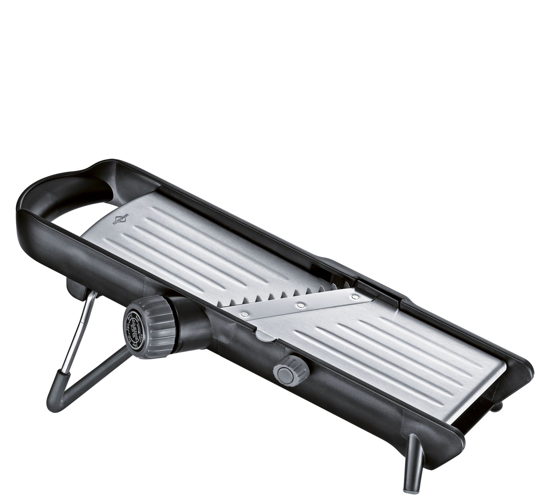 Veiligheid en stabiliteit zijn gegarandeerd. De groentesnijder is voorzien van antislipvoetjes, een snijrestenhouder én een beschermkap voor de vlijmscherpe messen van roestvrij staal.