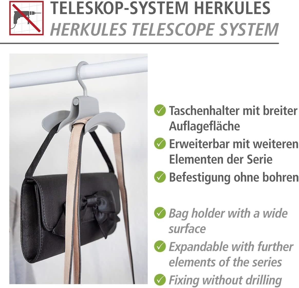 Creëer een georganiseerde en stijlvolle opbergoplossing voor je tassen en accessoires met deze praktische en stevige handtashouders, ontworpen voor het flexibele Hercules-systeem van WENKO.