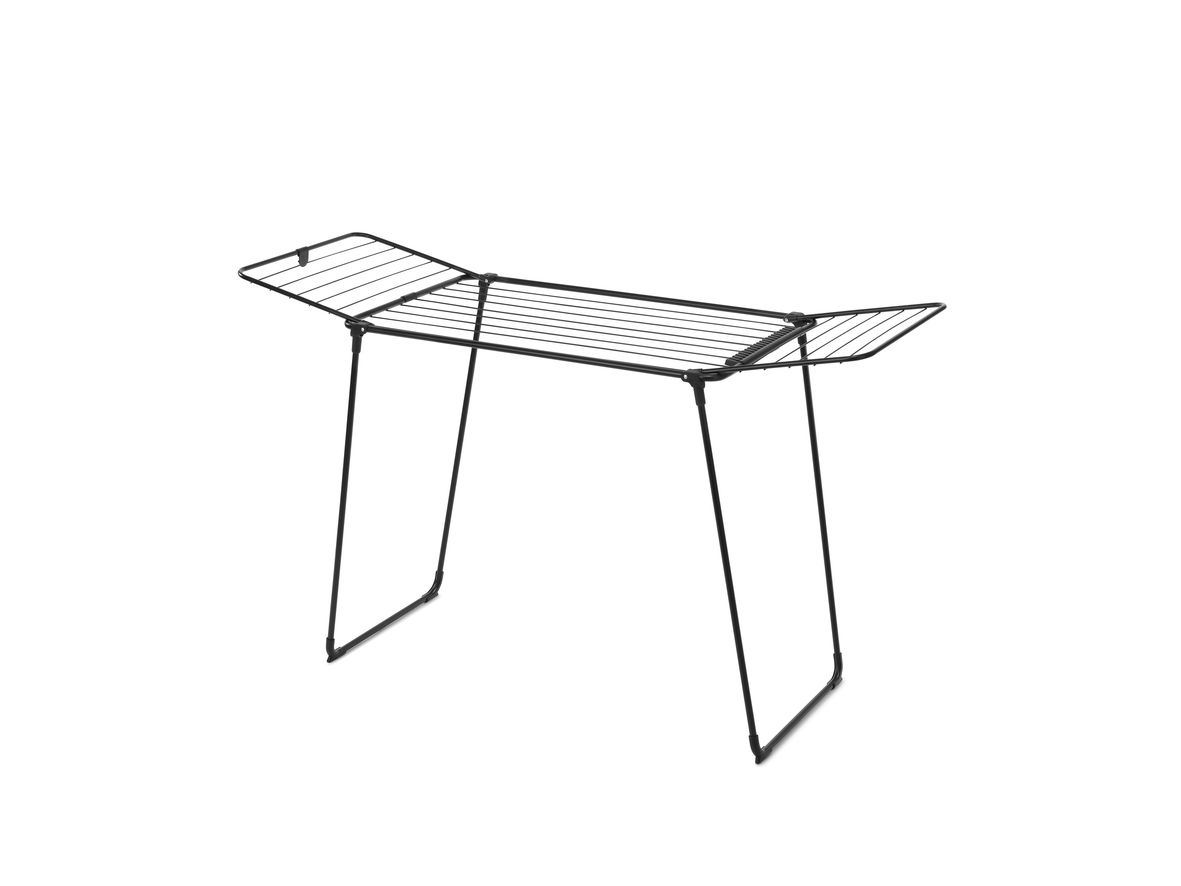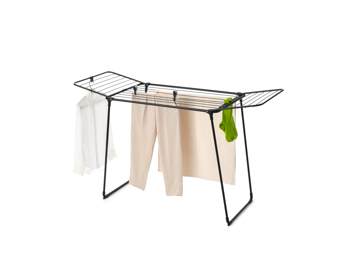 Het Brabantia HangOn droogrek in mat zwart is een handige oplossing om was op een natuurlijke manier te drogen. Met 18 meter droogruimte is er genoeg plek voor meer dan één waslading, inclusief grotere stukken zoals handdoeken. De lijnen zijn extra breed en zitten wat verder uit elkaar, waardoor ophangen makkelijker gaat en de was sneller droogt.