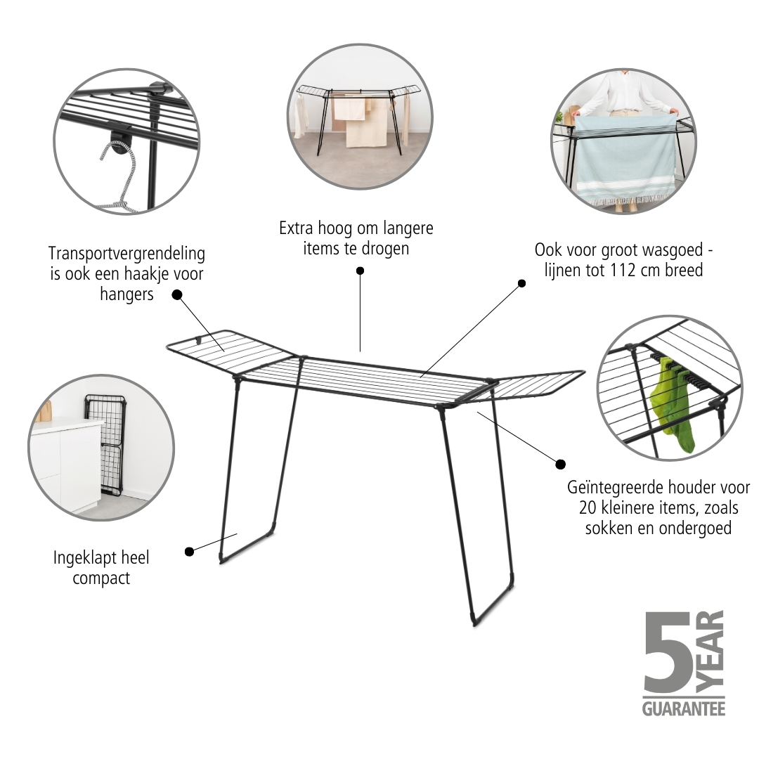 Voor kleinere items zoals sokken en ondergoed is er een geïntegreerde houder, waardoor knijpers vaak niet nodig zijn. Het rek is stevig in gebruik en eenvoudig te verplaatsen dankzij de transportvergrendeling, die ook als haak voor hangers kan dienen. Na gebruik klap je het compact in, zodat het weinig ruimte inneemt.