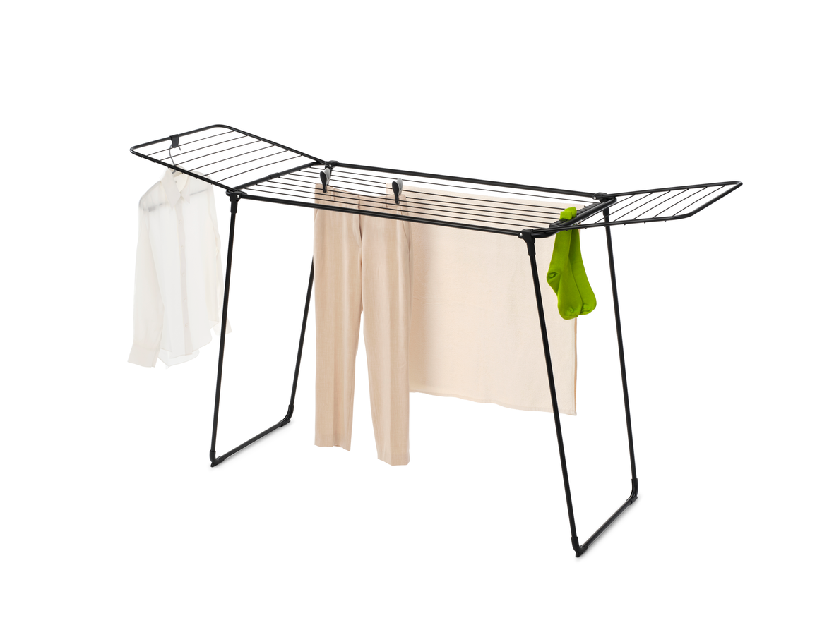 Het Brabantia HangOn droogrek in mat zwart is een handige oplossing om was op een natuurlijke manier te drogen. Met 22 meter droogruimte is er genoeg plek voor twee wasladingen, inclusief grotere stukken zoals handdoeken. De lijnen zijn extra breed en zitten wat verder uit elkaar, waardoor ophangen makkelijker gaat en de was sneller droogt.