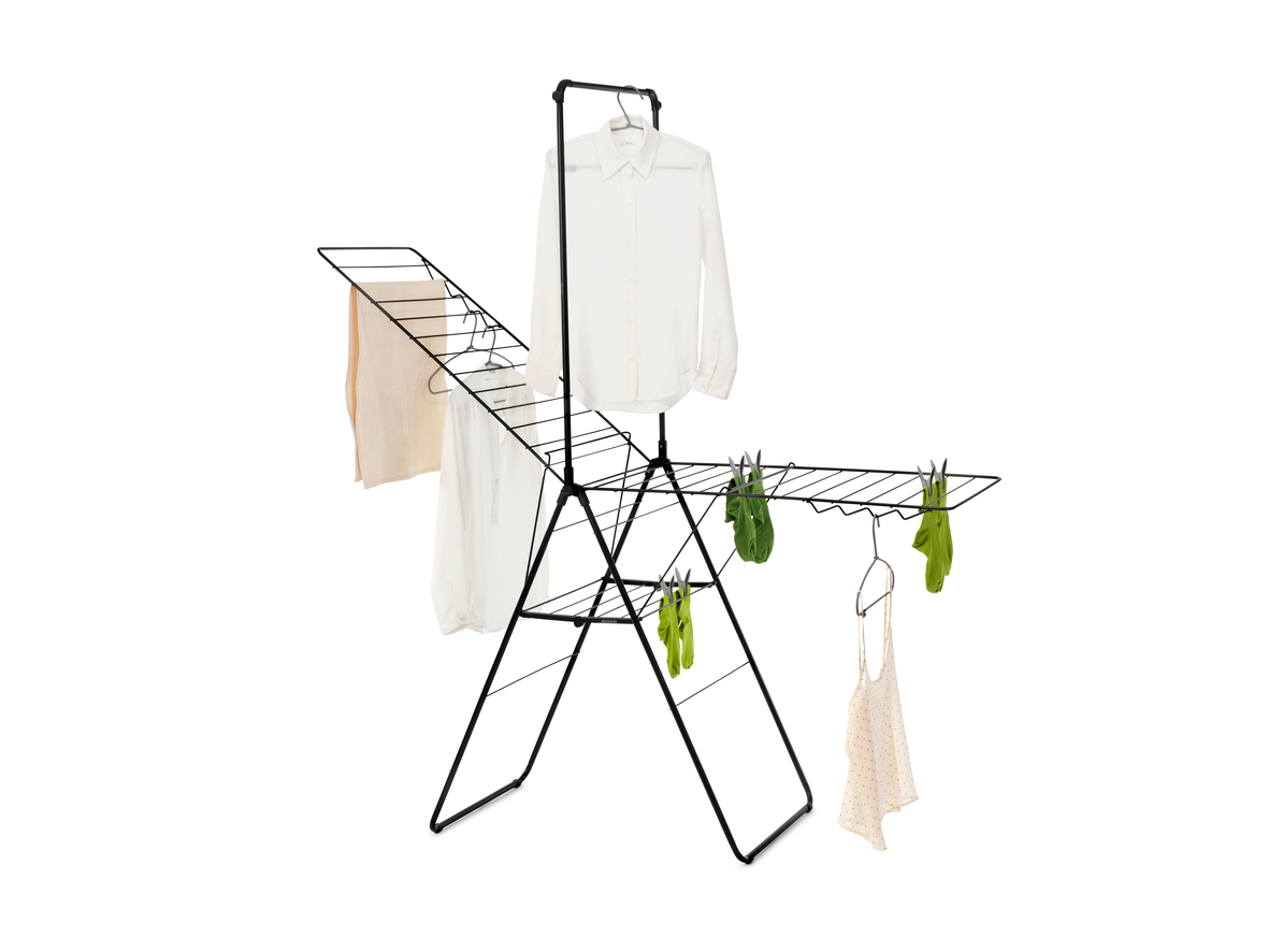 Het rek heeft verstelbare vleugels, waardoor het geschikt is voor zowel kleine kledingstukken als grotere items. Voor overhemden en blouses zijn er handige haken en een stang waar meerdere kleerhangers aan kunnen hangen. Ook is er een plateau voor het plat drogen van fijne was.