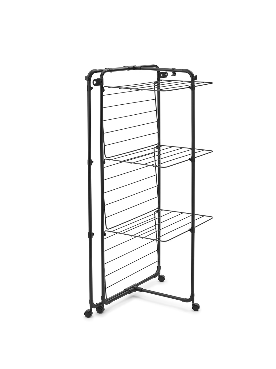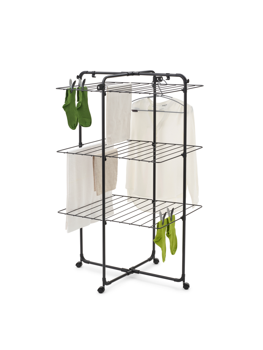 De toren heeft rekken op drie verschillende hoogtes die je eenvoudig kunt in- en uitklappen. Daardoor is hij geschikt voor zowel kleine kledingstukken als grotere items zoals handdoeken. Er zijn ook extra haken en houders voor kleerhangers, wat handig is voor bijvoorbeeld overhemden.