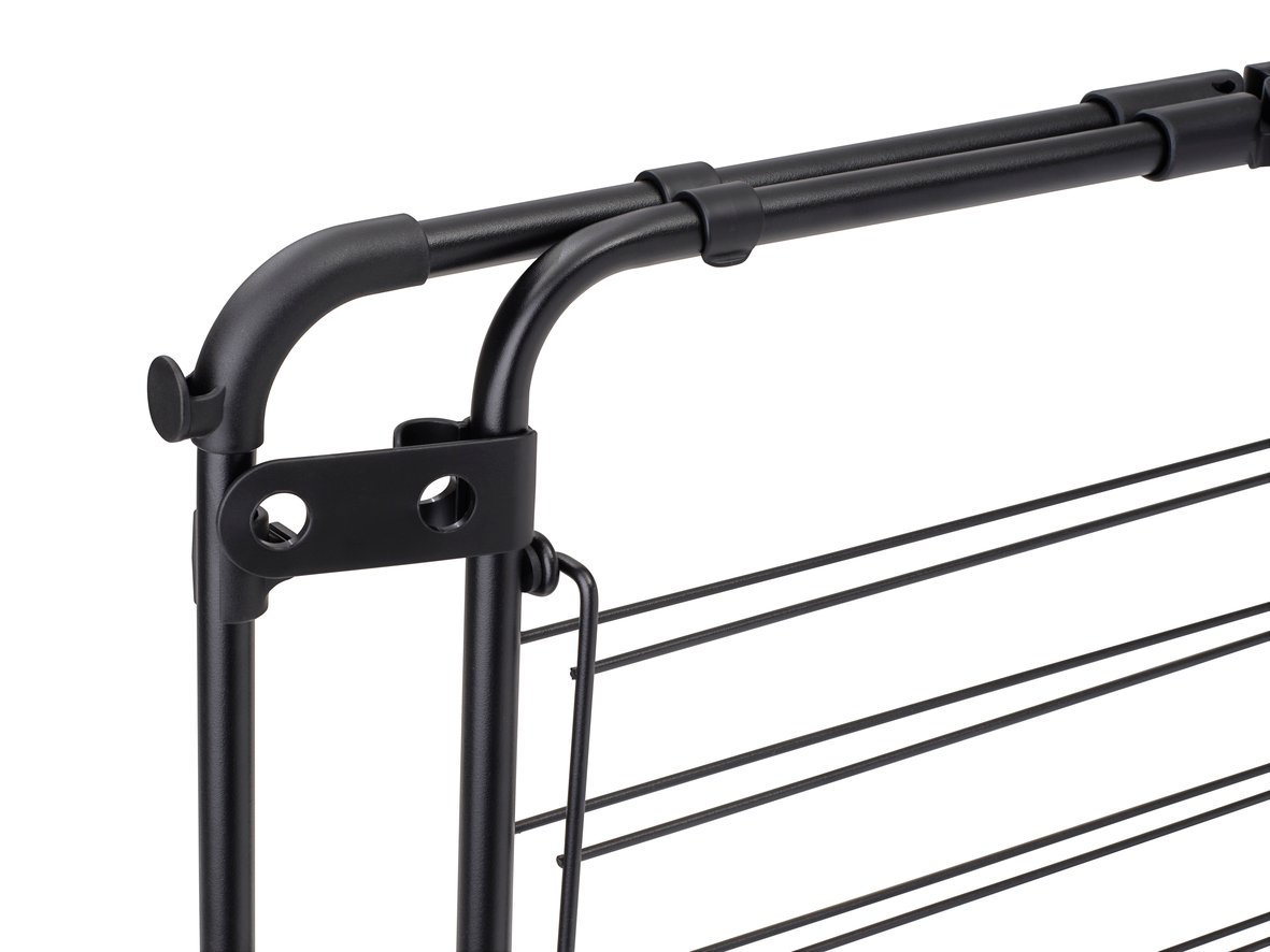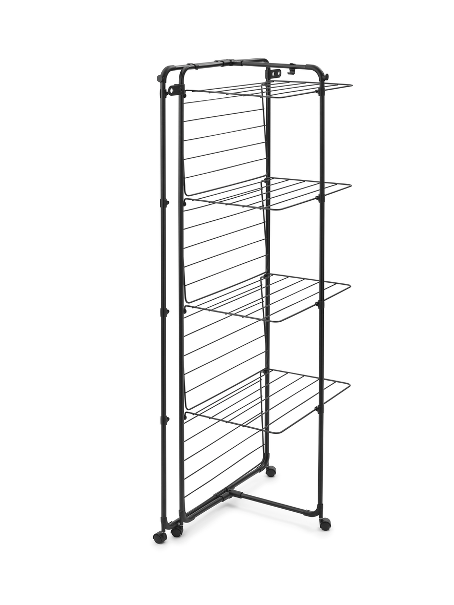 De toren heeft rekken op vier hoogtes die je flexibel kunt in- en uitklappen. Hierdoor is er ruimte voor zowel kleine kledingstukken als langere items zoals broeken en handdoeken. De extra hoogte maakt het ophangen van lang wasgoed een stuk makkelijker. Ook zijn er haken en houders voor kleerhangers toegevoegd voor extra ophangmogelijkheden.