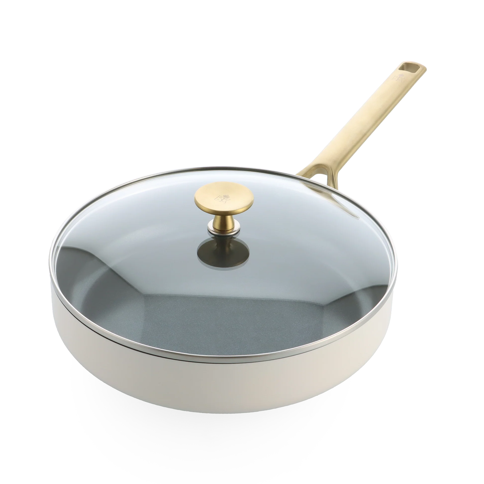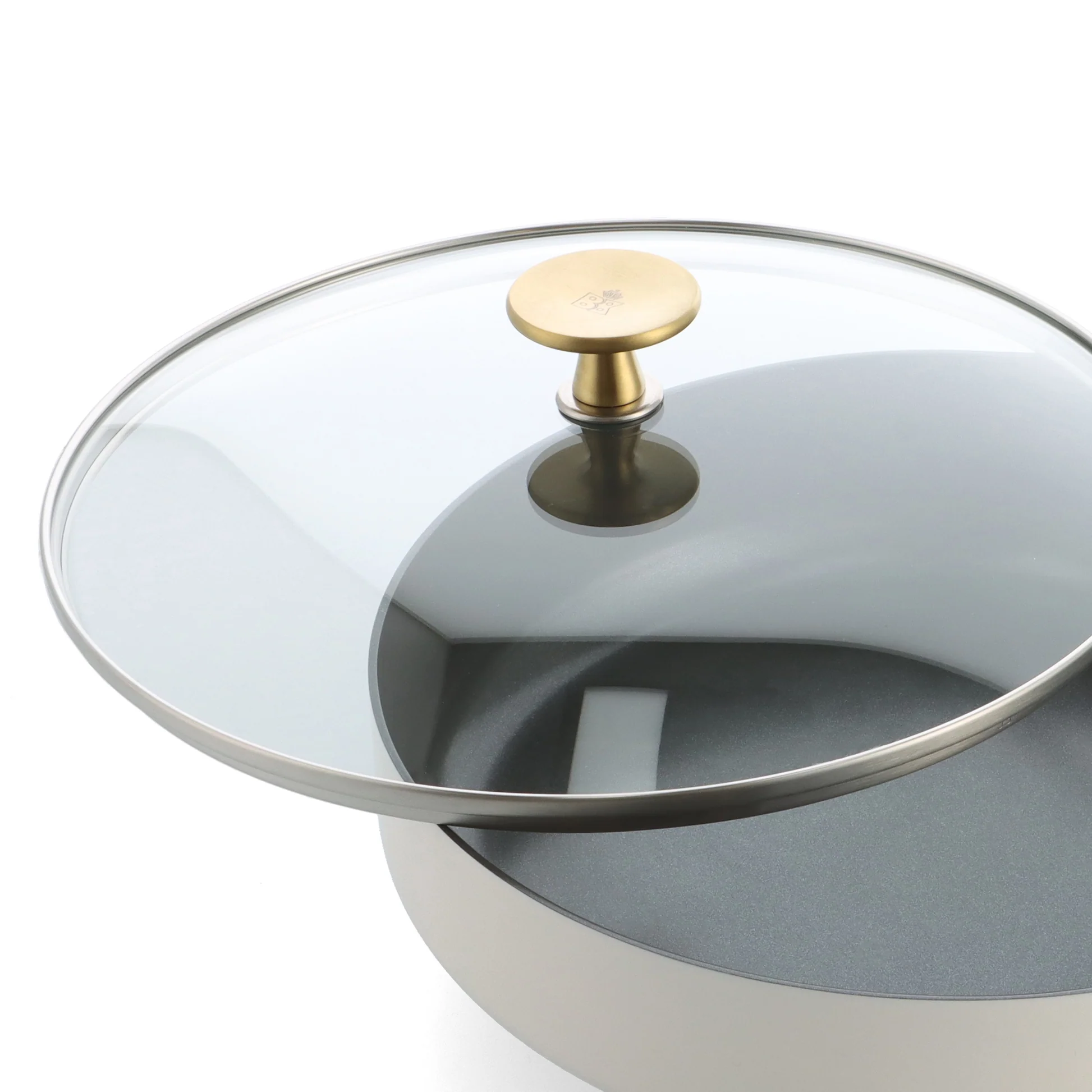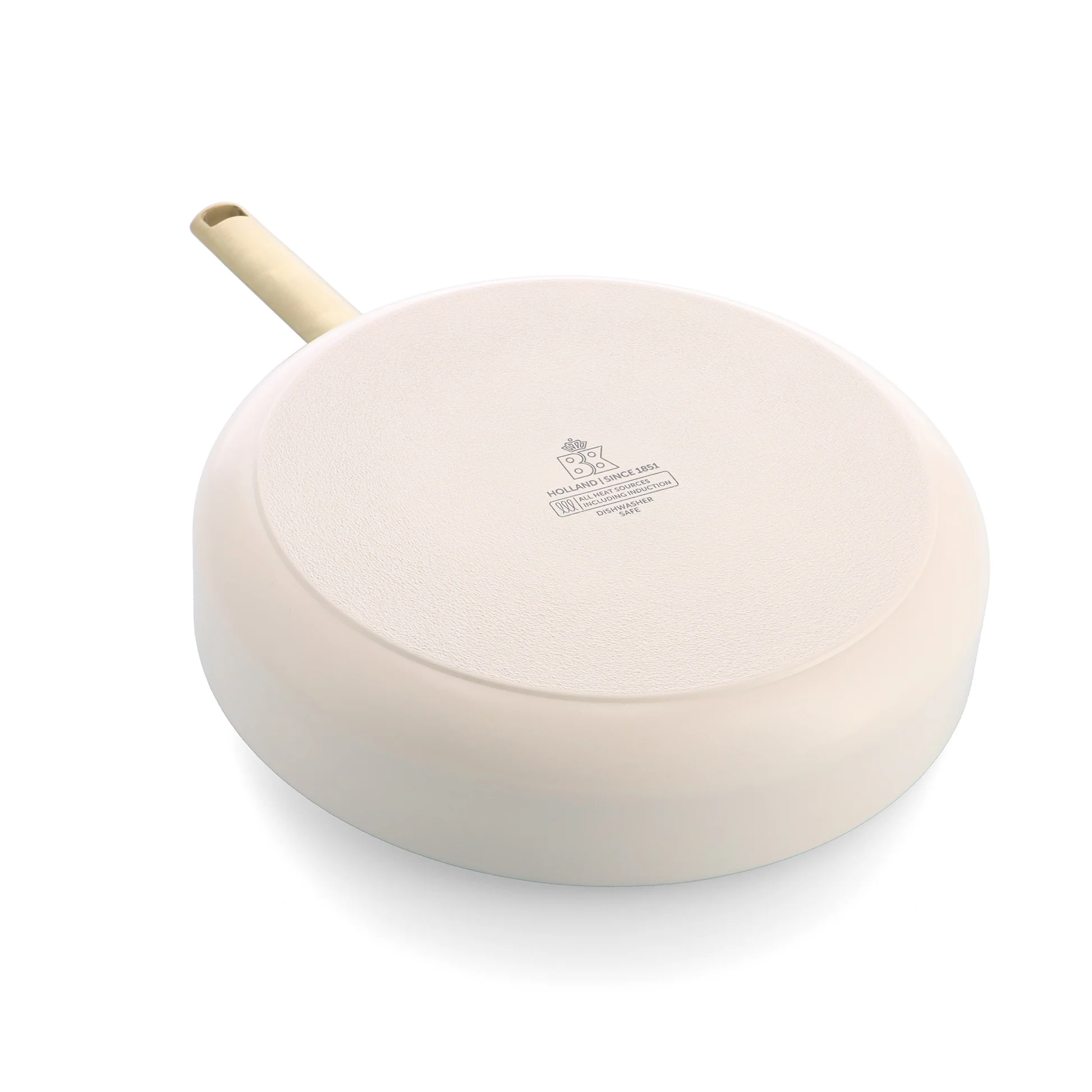 De BK Sublime hapjespan van 28 cm combineert stijl en prestaties in één elegant ontwerp. De zachte crème kleur en de roestvrijstalen greep geven de pan een moderne, luxueuze uitstraling die in elke keuken tot zijn recht komt.