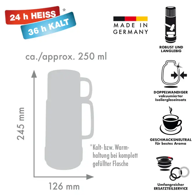 De zilvergrijze isoleerfles van Rotpunkt met een inhoud van 0,25 liter heeft een strak design en betrouwbare isolatie. Dankzij de slanke vorm is hij eenvoudig met één hand te gebruiken en ideaal voor dagelijks gebruik, thuis of onderweg. Met een capaciteit van circa 0,25 liter is de fles goed voor ongeveer 1 tot 2 kopjes koffie of thee en geschikt voor 1 persoon.
