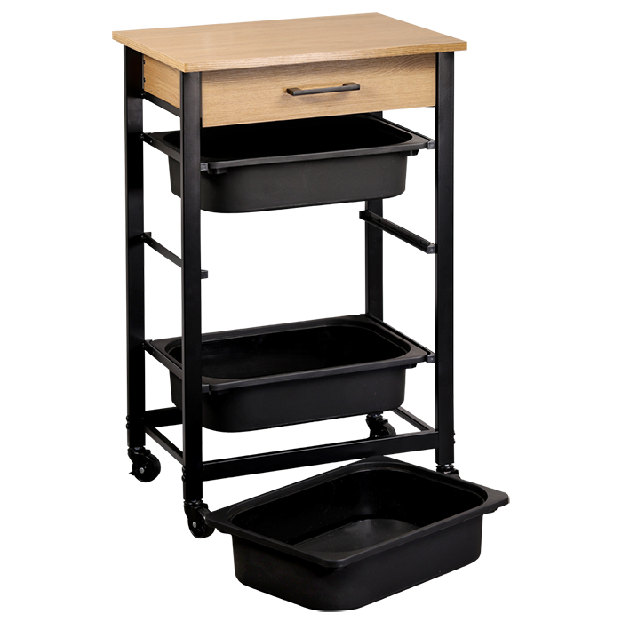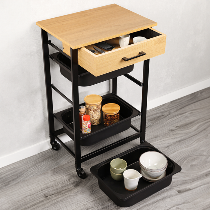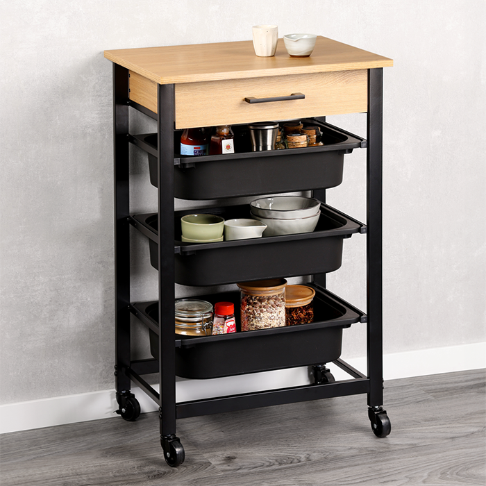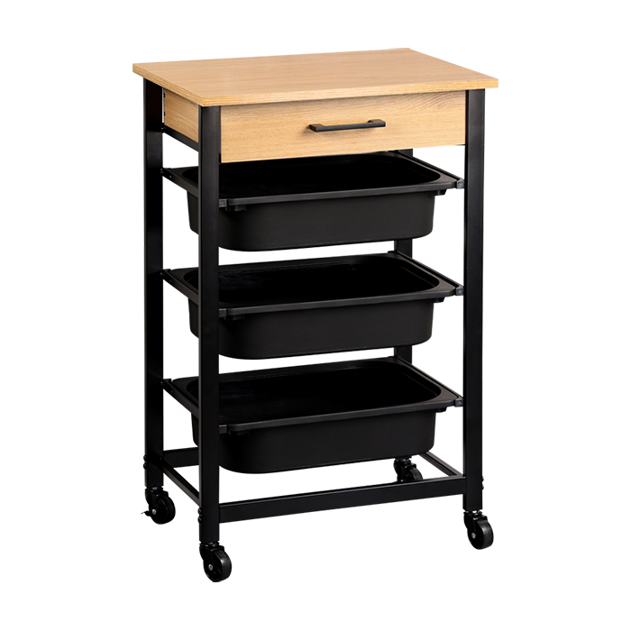 Deze opbergtrolley biedt praktische opbergruimte in een compact formaat. Het model is uitgerust met drie uitneembare kunststof bakken en een geïntegreerde lade, waardoor voorraden, servies en keukenaccessoires overzichtelijk kunnen worden opgeborgen. Het bovenblad met houtlook biedt extra werk- of aflegruimte.
