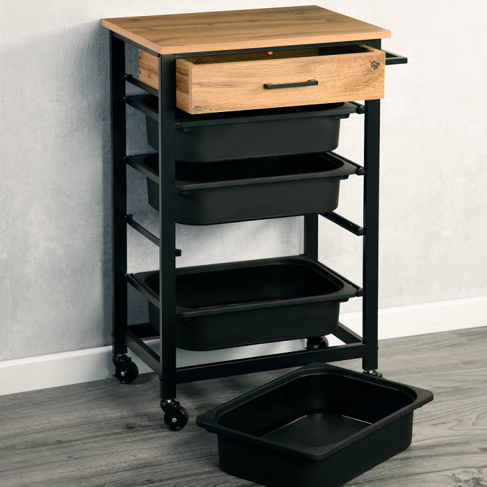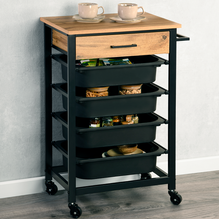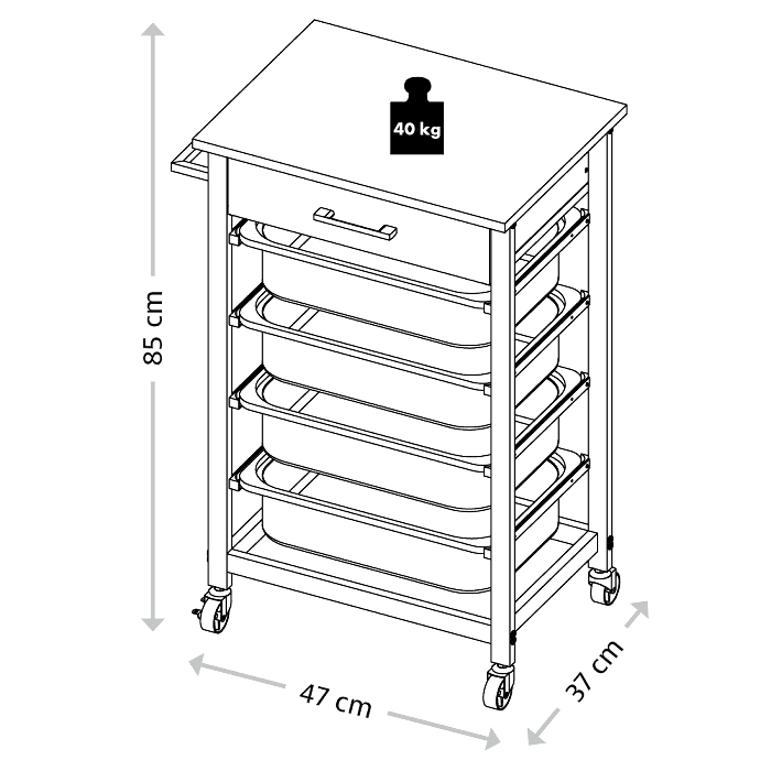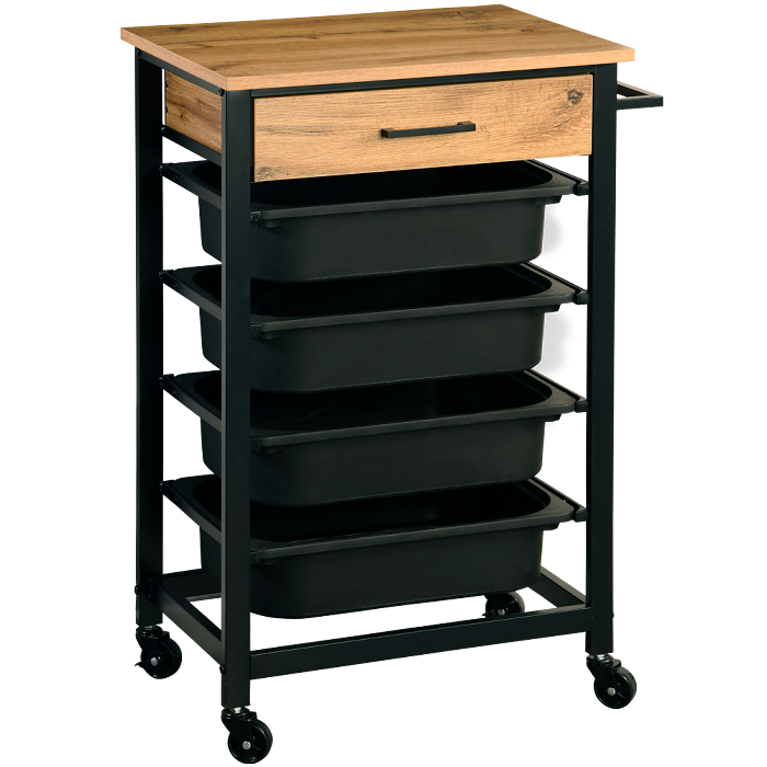 Het bovenblad biedt een praktische werkruimte, terwijl de geïntegreerde lade en vier ruime kunststof opbergboxen van elk 12 liter u voldoende opbergruimte geven voor keukengerei, ingrediënten of andere benodigdheden. Dankzij de handdoekhouder houdt u bovendien alles binnen handbereik tijdens het koken of serveren.