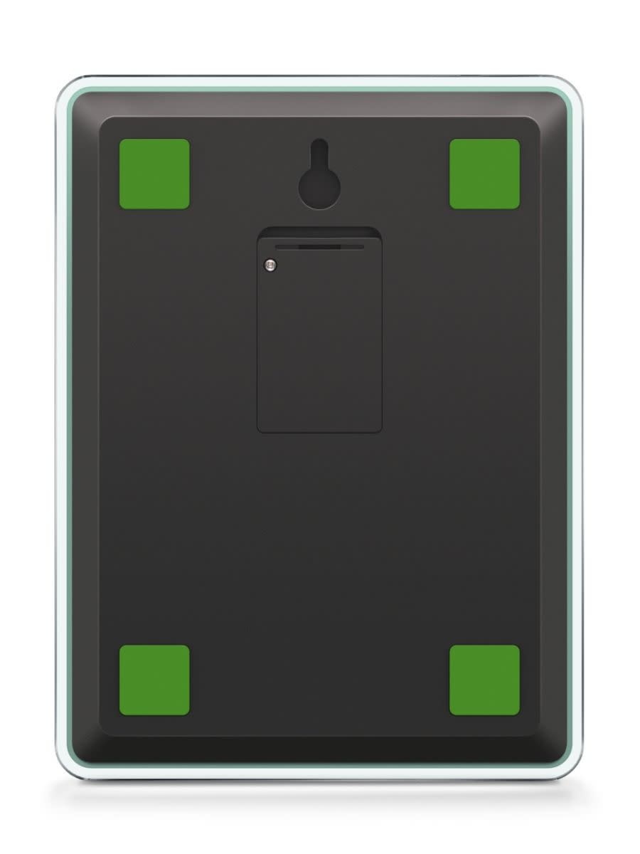 Het platte ontwerp zorgt ervoor dat de weegschaal weinig ruimte inneemt, zowel in een lade als aan de wand via het geïntegreerde ophangsysteem. Antislipvoetjes zorgen voor stabiliteit tijdens het gebruik. De automatische uitschakeling draagt bij aan een zuinig energieverbruik. Batterijen worden meegeleverd en gaan, ook bij regelmatig gebruik, langdurig mee. Het batterijvak is kindveilig afsluitbaar en de weegschaal heeft 5 jaar garantie.