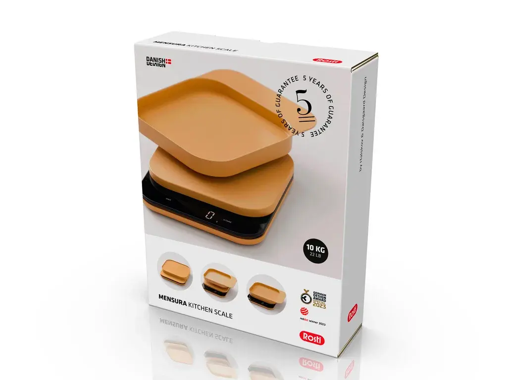 De Rosti Mensura keukenweegschaal in de kleur Curry heeft een helder LED-display en biedt een maximale weegcapaciteit van 10 kg (22 lb), met een nauwkeurigheid van 1 gram (0,1 oz). De bijbehorende kom is gemaakt van ABS en heeft een inhoud van 300 ml. Wanneer de weegschaal niet in gebruik is, dient de kom als deksel om de weegschaal netjes op te bergen.