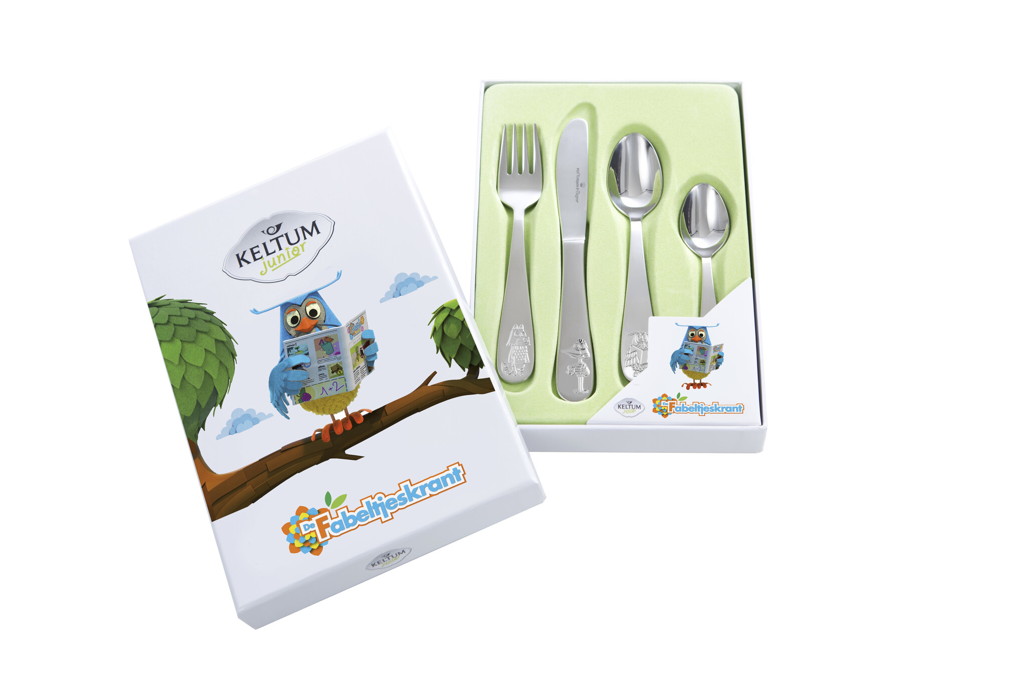Hallo meneer de Uil, waar brengt u ons naar toe?": naar het nieuwste kinderbestek van Keltum Junior natuurlijk! De fabeltjeskrant maakt na bijna 50 jaar een comeback met een bioscoopfilm en een tv-serie. Een aantal legendarische dieren uit het Grote Dierenbos van Fabeltjesland staan mooi afgebeeld op deze 4-delige kinderbestekset. Naast meneer de Uil zijn dat Juffrouw Ooievaar, Bor de Wolf en Zoef de Haas. Verpakt in de vrolijke en kleurrijke giftbox is het een prachtig geschenk voor alle lieve kijkbuiskinderen.