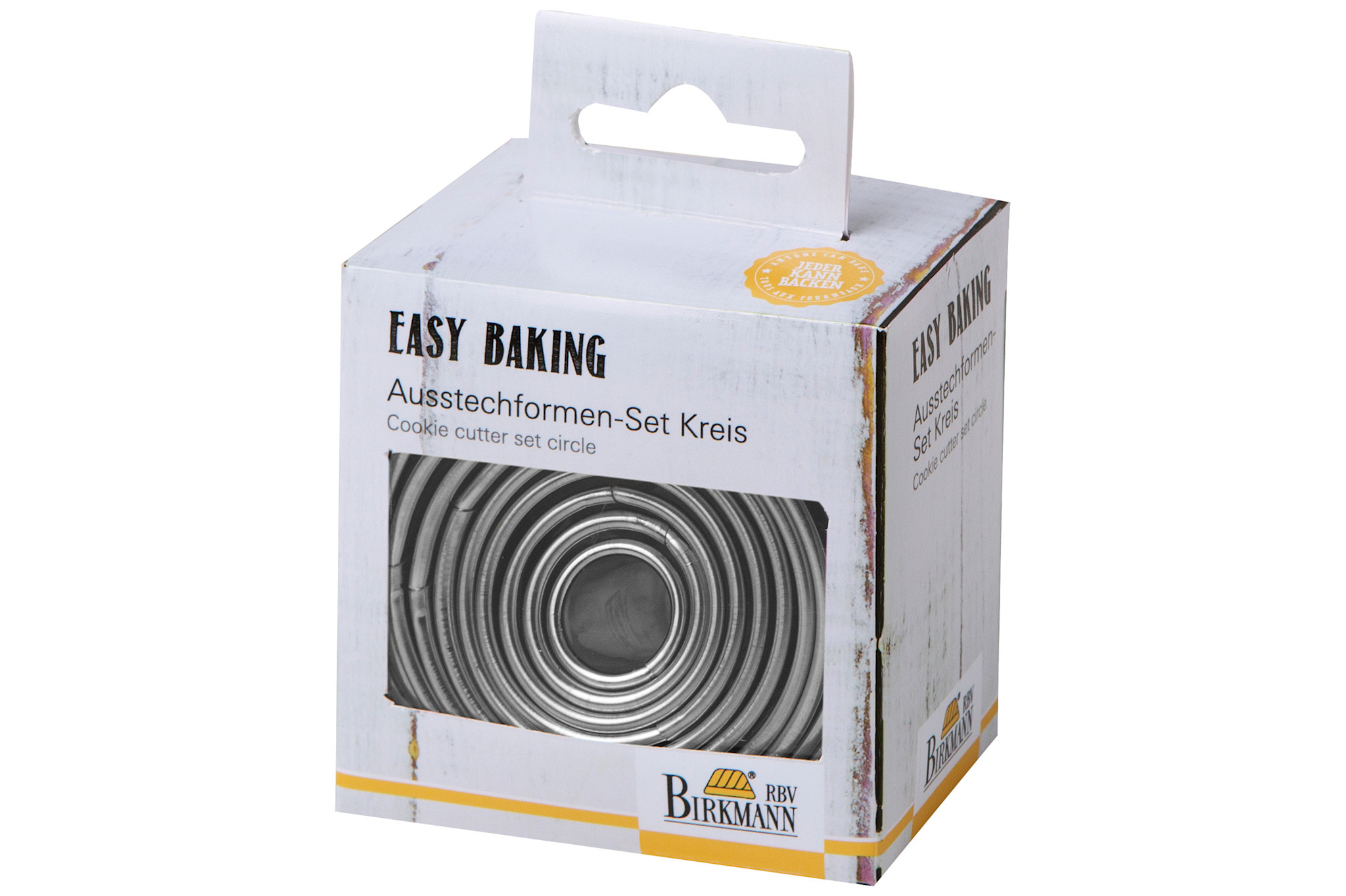 Set van 10 ronde koekjesvormen uit de Easy Baking lijn van Birkmann. De vormpjes hebben verschillende diameters, van ongeveer 1,5 cm tot 7 cm, waardoor ze handig zijn voor het uitsteken van koekjes in diverse maten.