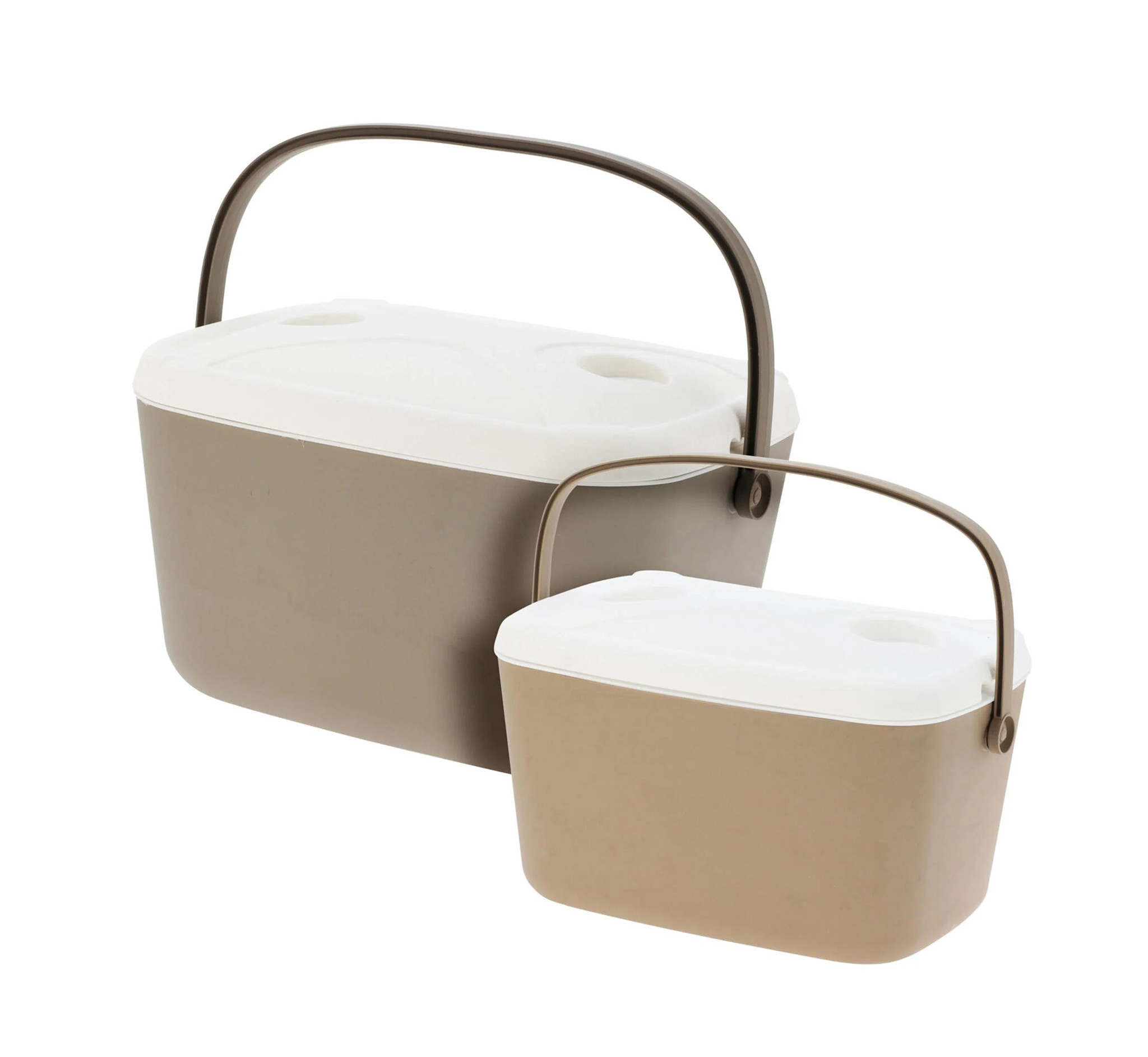 Met deze twee koelboxen van 30 liter en 15 liter in een stijlvolle beige kleur houdt u uw eten en drinken onderweg heerlijk koel.