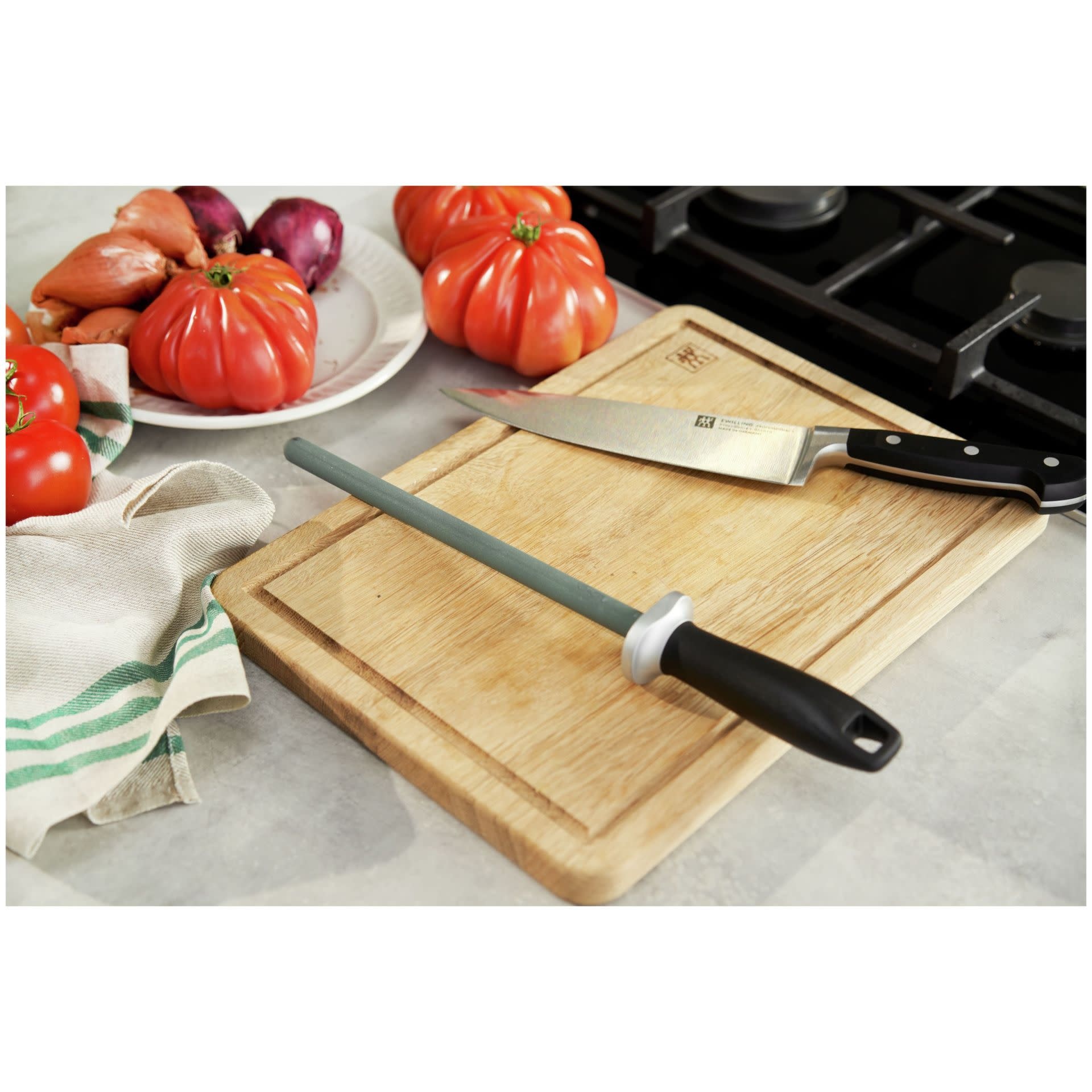Deze ZWILLING set, bestaande uit een koksmes en keramisch aanzetstaal, biedt alles wat je nodig hebt om dagelijks met perfect scherpe messen te werken. Het hoogwaardige koksmes is vervaardigd uit staal met een speciale formule en beschikt over een FRIODUR-ijsgehard lemmet voor optimale hardheid, flexibiliteit en duurzaamheid. Ideaal voor het snijden van vlees, vis, groenten en kruiden. Het keramische aanzetstaal maakt het mes in een handomdraai weer vlijmscherp en is zacht voor het lemmet, waardoor het ook geschikt is voor gevoelige messen. De ergonomische handgrepen zorgen voor een veilige, comfortabele grip tijdens elke snijbeweging. Een onmisbare duo-set voor zowel professionele chefs als enthousiaste thuiskoks.