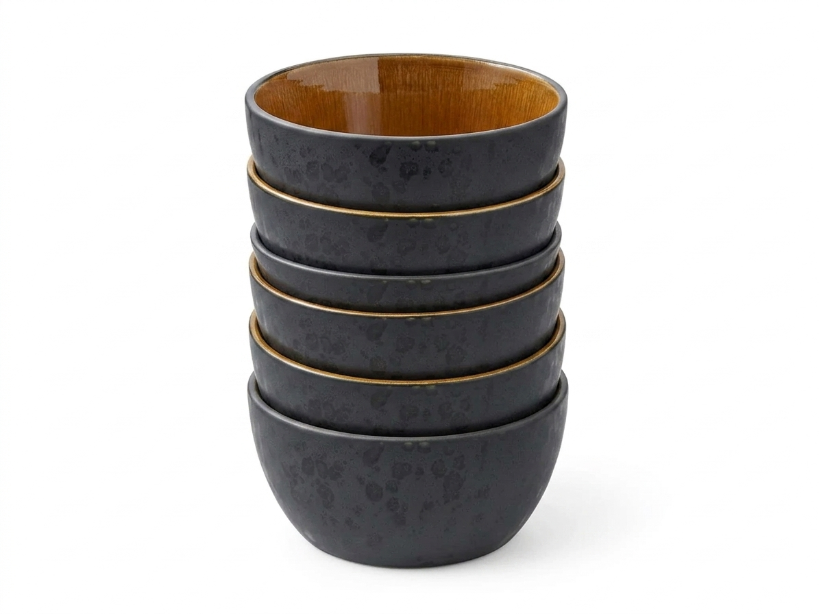 Deze set van 6 kommen van Bitz is een perfecte combinatie van modern design en praktisch gebruik. De kommen zijn gemaakt van hoogwaardig steengoed en vallen op door hun unieke afwerking: een matte zwarte buitenzijde en een glanzende amberkleurige binnenkant. Dit contrast zorgt voor een warme en eigentijdse uitstraling die op iedere tafel tot zijn recht komt.