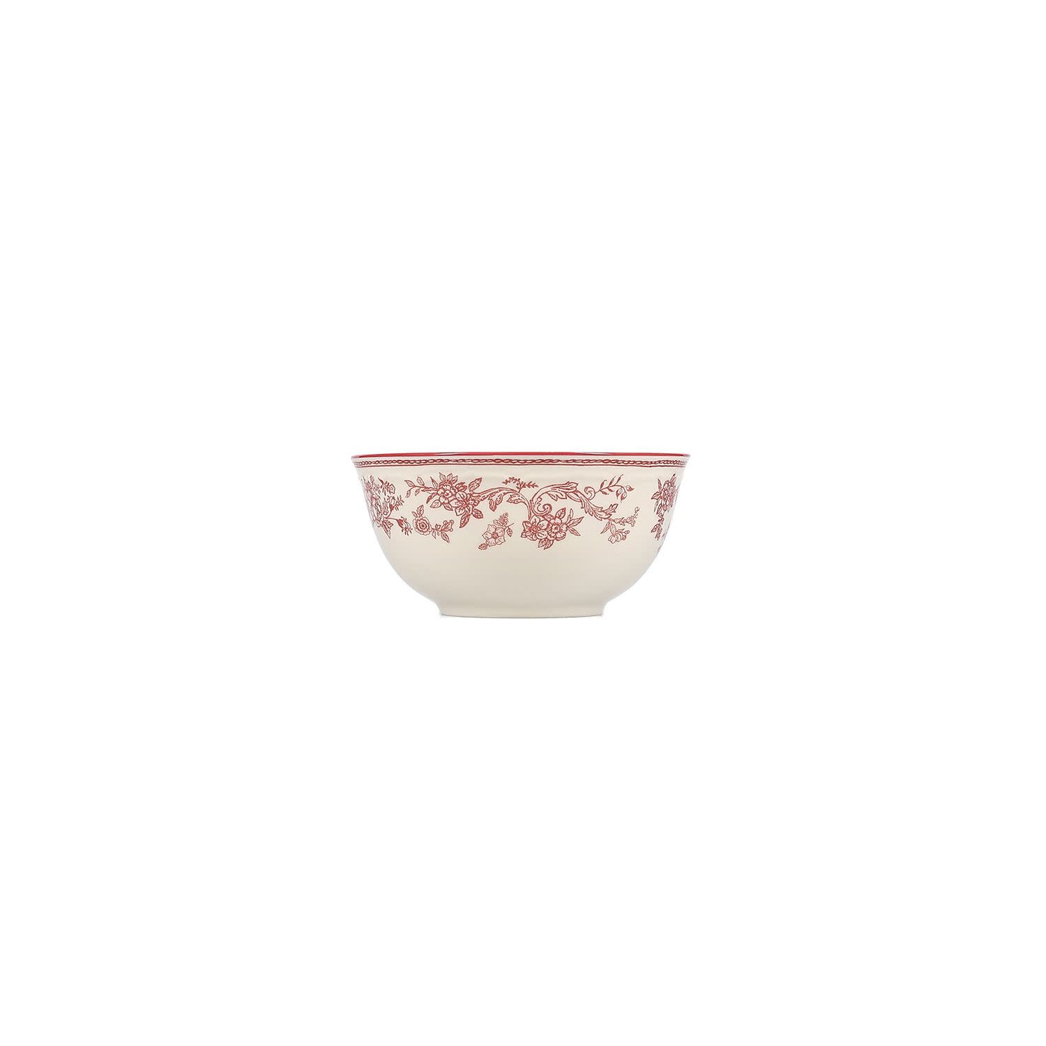 De kom uit de Cyril collectie heeft een diameter van 15 cm en een hoogte van 7 cm. Het ronde model is uitgevoerd in bordeauxrood met ivoorkleurige accenten en vervaardigd uit porselein. De afwerking bestaat uit een niet reactieve glazuurlaag met een subtiel patroon.