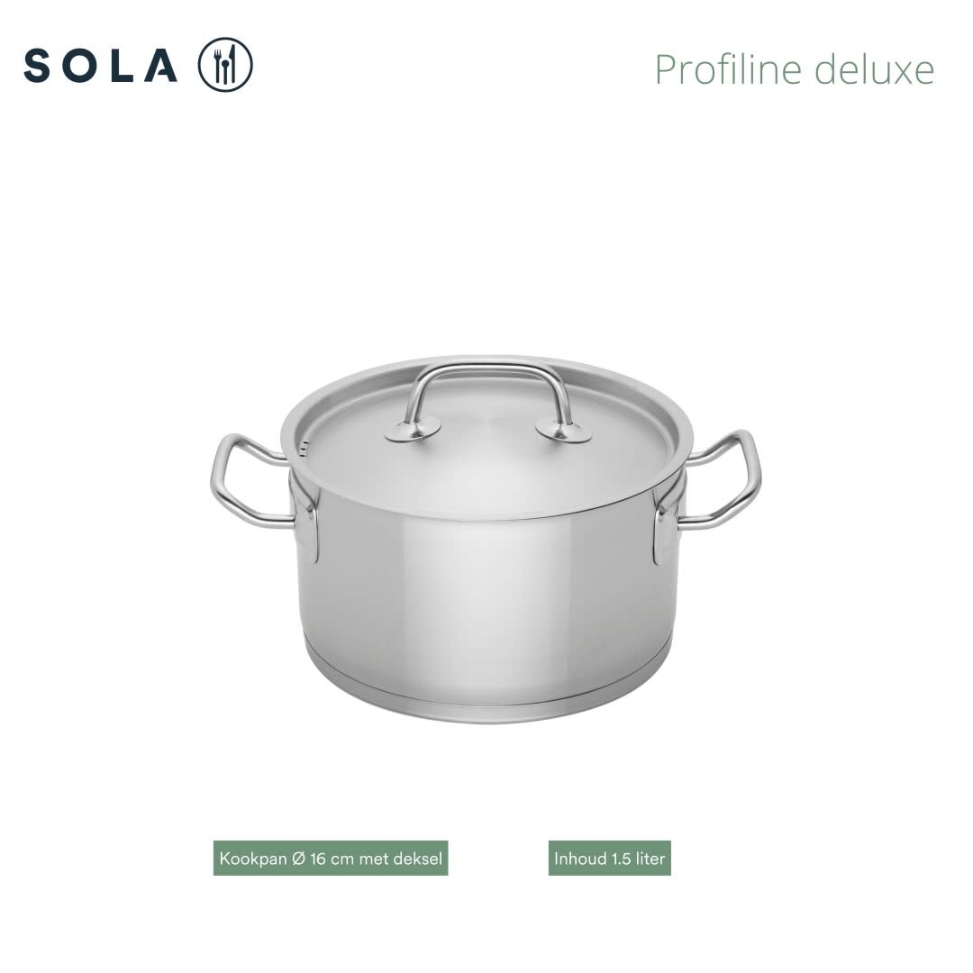 Met een inhoud van 1,5 liter is deze pan perfect geschikt voor het koken van kleine porties groenten, sauzen of bijvoorbeeld eieren. De meegeleverde stalen deksel sluit goed af en is voorzien van een stoomgaatje voor gecontroleerd koken. Deze pan is onderdeel van de populaire Profiline Deluxe serie, één van de best verkochte pannensets van Sola. Ideaal als uitbreiding of vervanging binnen je bestaande set.