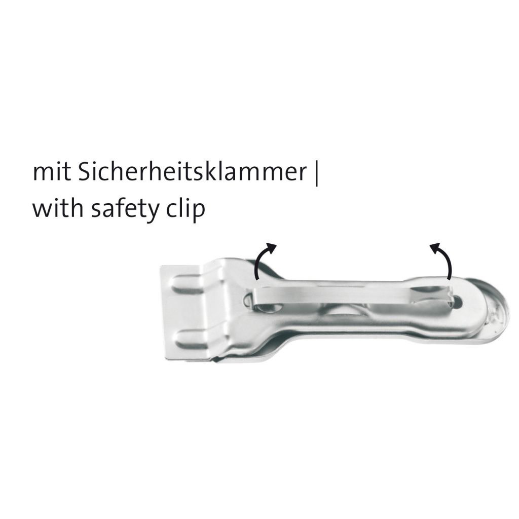 De schraper is voorzien van één verwisselbaar reinigingsmesje. Een beschermkap met vergrendeling zorgt voor veilige opberging in een lade. Wanneer het mesje bot wordt, kan dit eenvoudig worden vervangen.