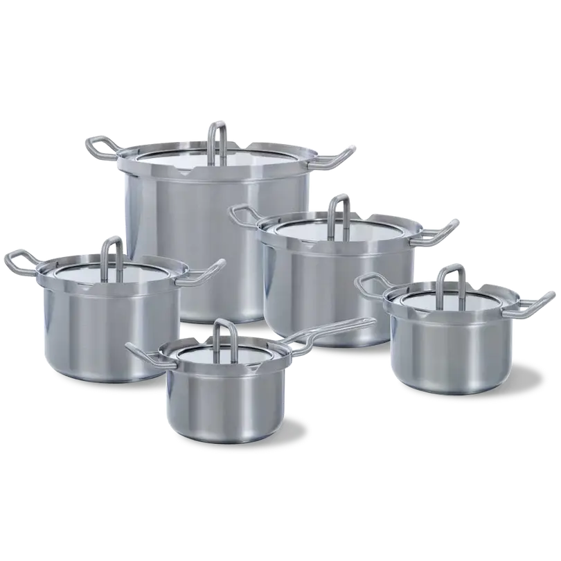 De pannen zijn gemaakt van hoogwaardig roestvrij staal en hebben een stevige, geborstelde afwerking. Dankzij de hoge vorm en de slim geplaatste grepen kun je eenvoudig grotere porties bereiden. De pannen zijn daarnaast compact stapelbaar, wat zorgt voor ruimtebesparing in je keukenkast.