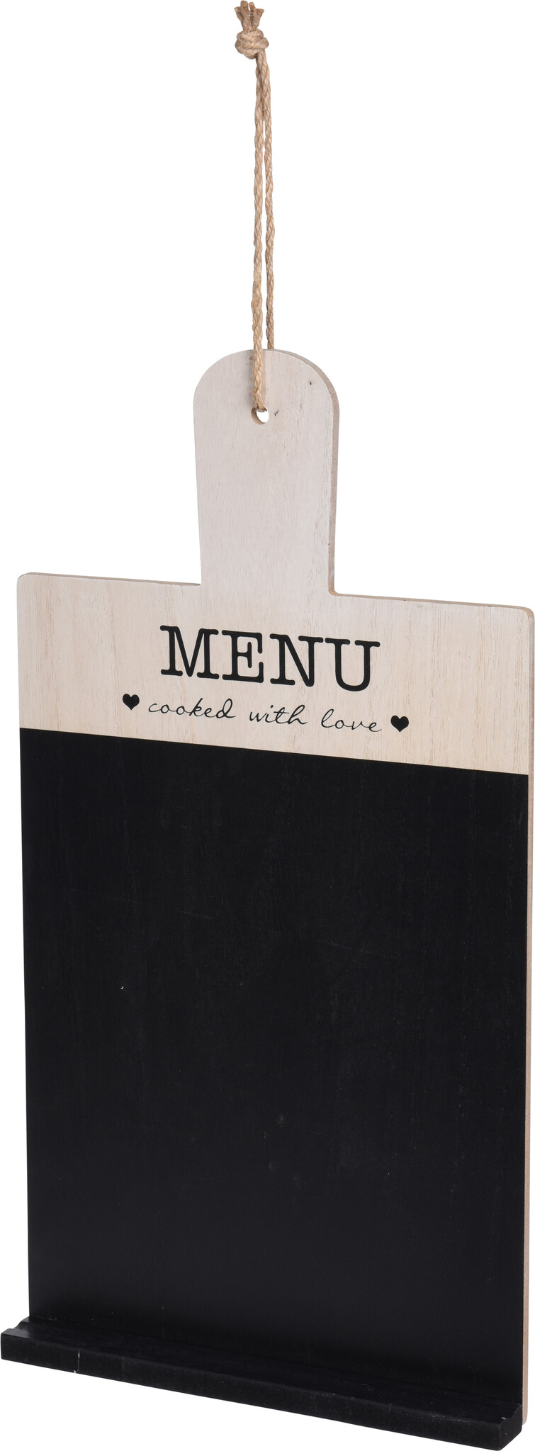 Deze snijplank in krijtbordvorm van Home & Styling is zowel praktisch als decoratief. Het bovenste deel is gemaakt van hout en heeft de tekst "MENU" en "cooked with love" met zwarte hartjes, wat zorgt voor een gezellige uitstraling in de keuken.