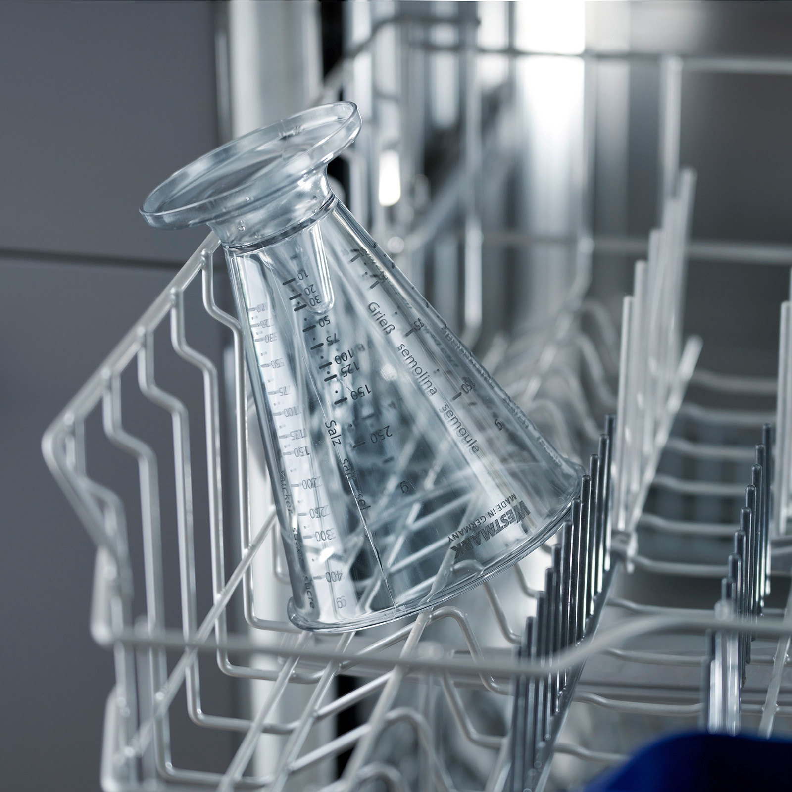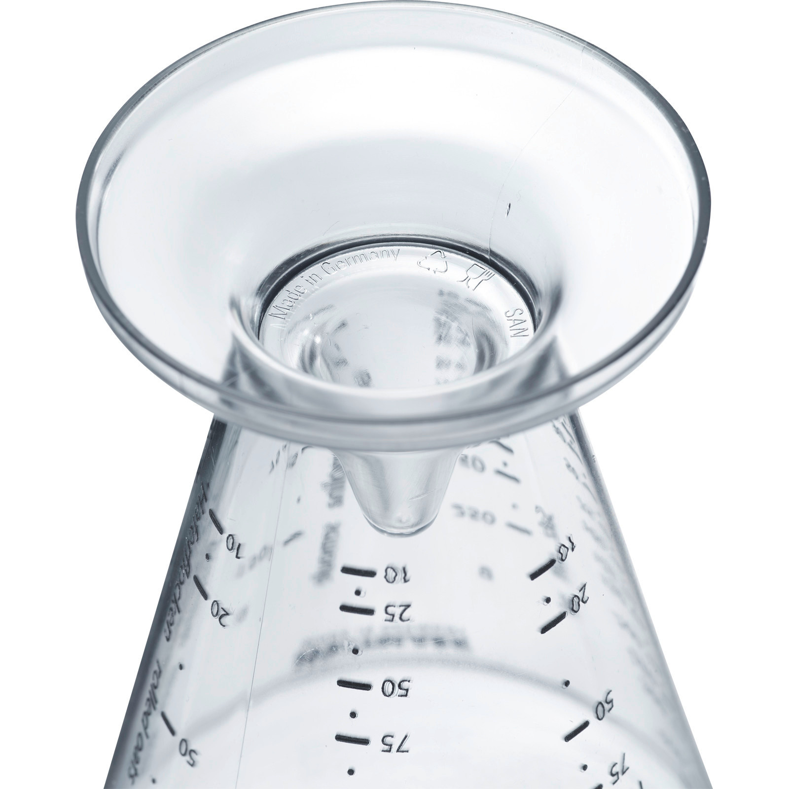 Een bijzonder kenmerk van deze maatbeker is de mogelijkheid om zelfs zeer kleine hoeveelheden af te meten, vanaf 10 gram of 10 milliliter. De trechtervormige opening maakt het eenvoudig om ingrediënten snel en precies in te vullen, wat het gebruiksgemak verhoogt. De maatbeker is gemakkelijk schoon te maken, zowel met de hand als in de vaatwasser.