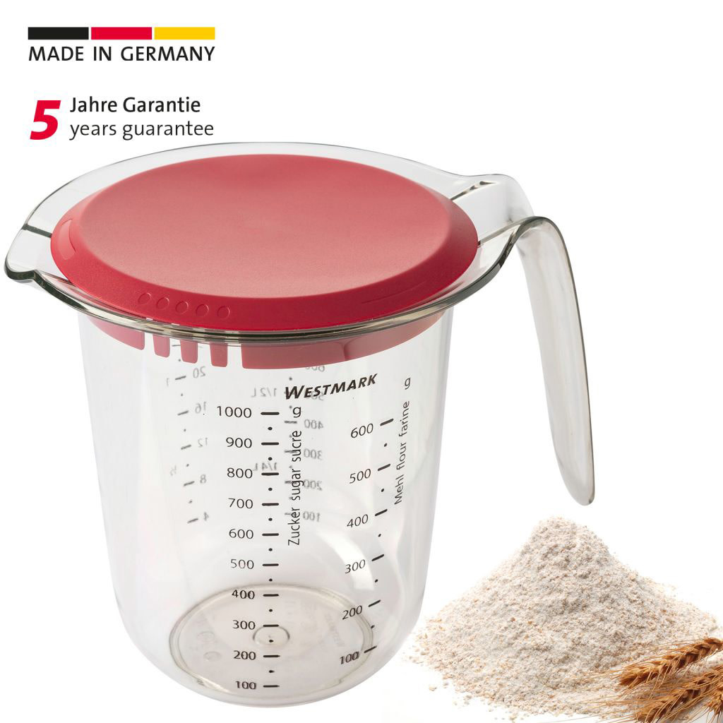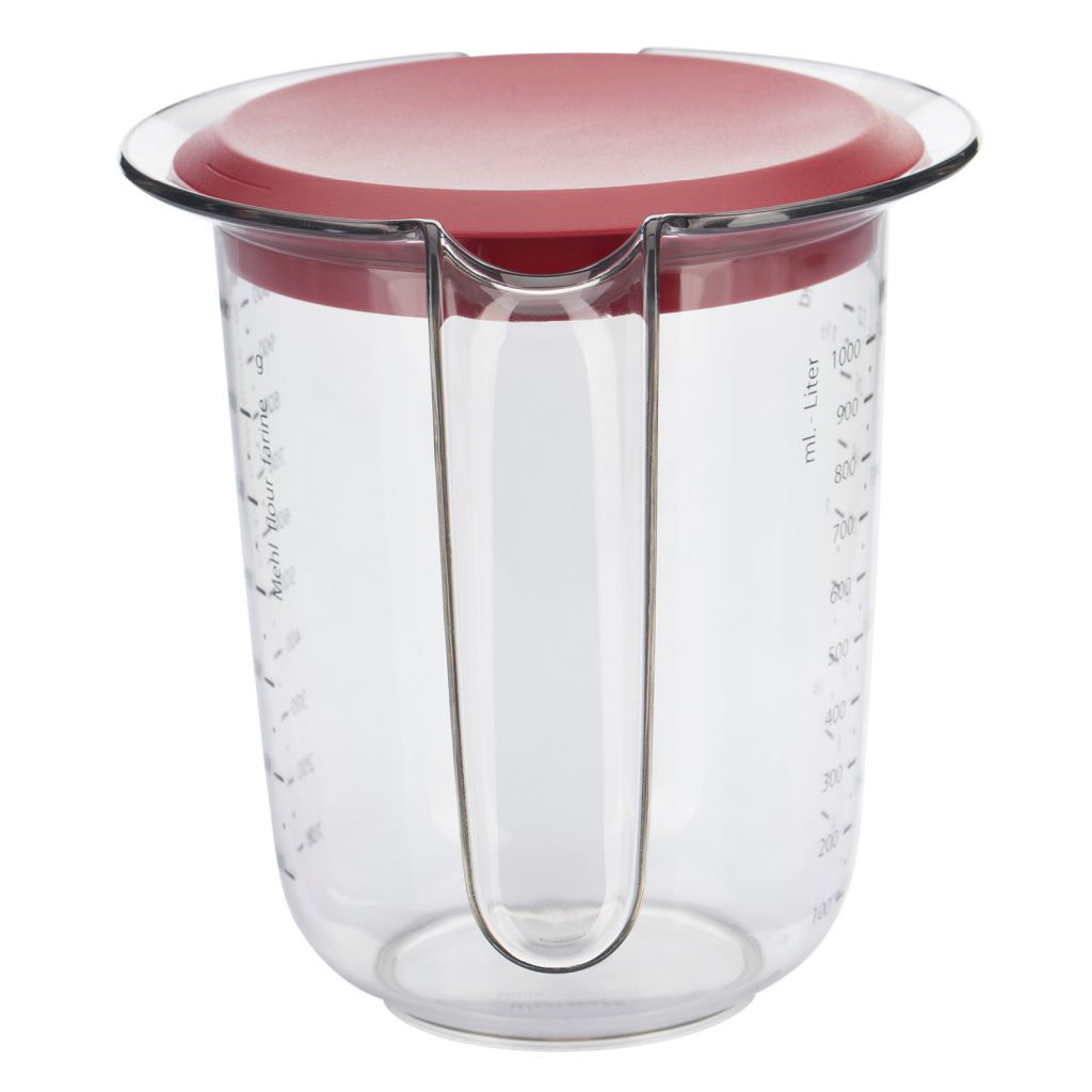 Met deze maatbeker van 1 liter is het afmeten van ingrediënten een fluitje van een cent. Dankzij de verschillende meeteenheden bent u op elk recept voorbereid. De schenktuit maakt het gemakkelijk om te schenken en voorkomt onnodige verspilling. Het deksel met zeef zorgt voor klontvrij schenken en helpt de inhoud hygiënisch te bewaren. Na gebruik kan de maatbeker eenvoudig in de vaatwasser worden gereinigd.