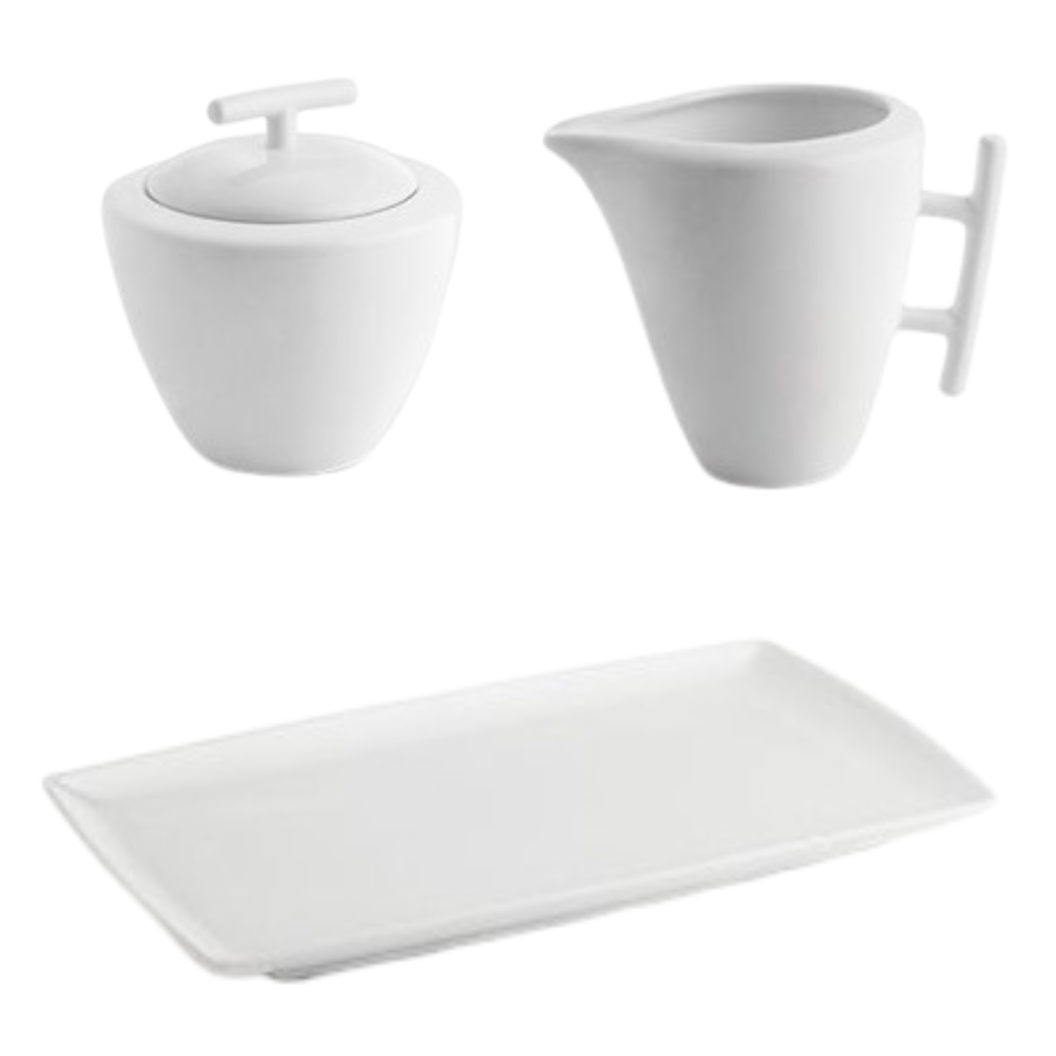 De set bestaat uit een 23cl melk- en sauskan, een 35cl suikerpot en een 24x13cm serveerschaal. De melkkan maakt het schenken van melk, room of sausjes eenvoudig en nauwkeurig, terwijl de suikerpot je zoete ingrediënten overzichtelijk en binnen handbereik houdt. De serveerschaal biedt een stijlvolle manier om broodjes, gebak of andere lekkernijen te presenteren. Dankzij de strakke, uitgepuurde vormen en het minimalistische design past de set in uiteenlopende stijlen en interieurconcepten.