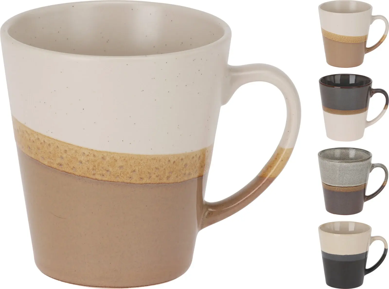 De mokken hebben een duo-tone reactieve glazuurafwerking en worden assorti geleverd in vier kleurcombinaties, zoals wit met zwart en grijstinten met bruin. Dit geeft elke mok een eigen uitstraling en zorgt voor wat variatie in de kast.