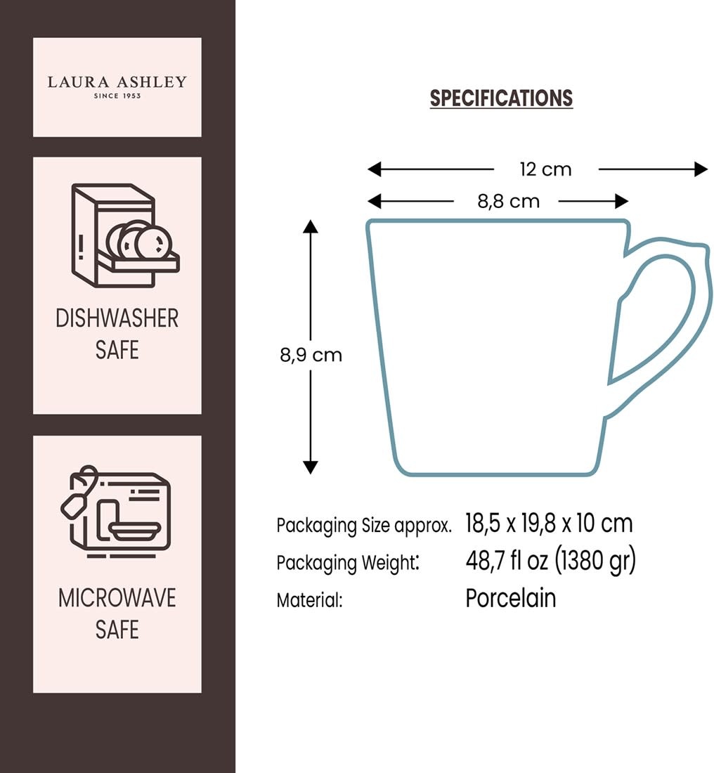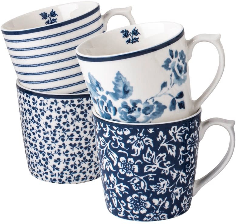 Begin je dag in stijl met deze set van 4 porseleinen mokken uit de Blueprint Collectables van Laura Ashley. De mokken (32 cl) zijn perfect voor een royale kop koffie of thee tijdens een ontspannen ontbijt. Elk exemplaar heeft een uniek blauw dessin dat rust en elegantie uitstraalt aan je keukentafel.