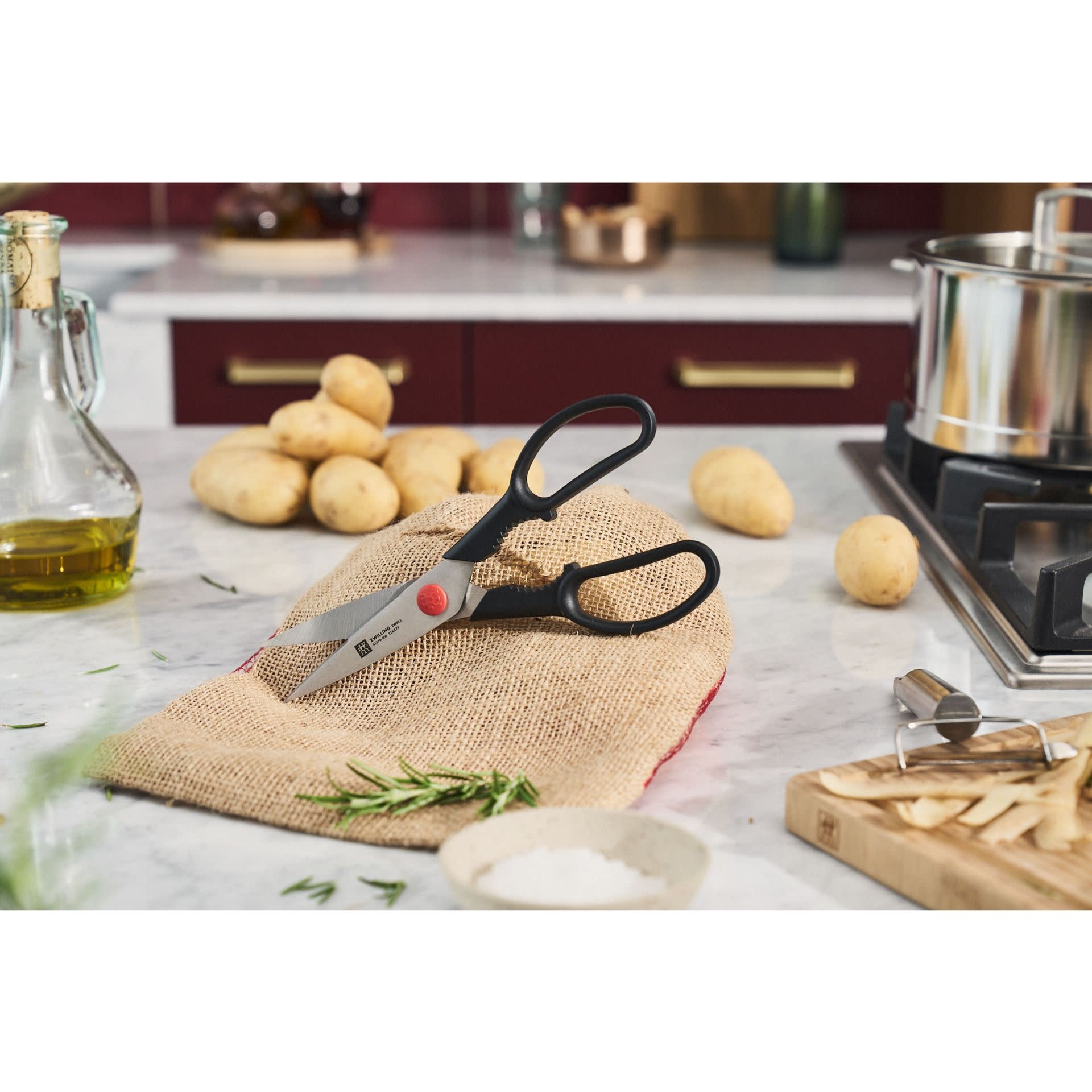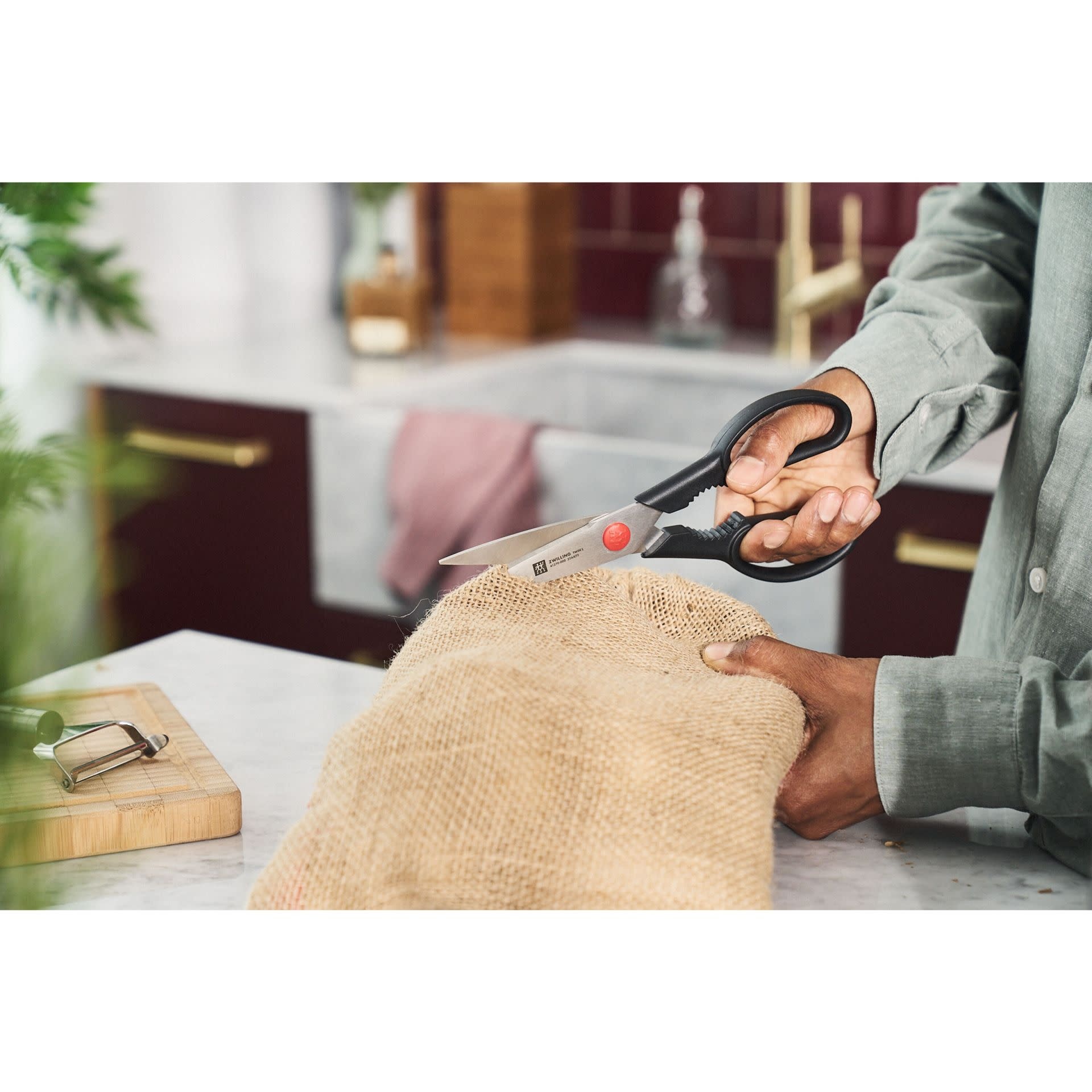 De TWIN L multifunctionele schaar is een onmisbaar gereedschap in elke keuken en daarbuiten. Met een lengte van 20,5 cm biedt deze schaar veelzijdigheid in zijn gebruik. Of het nu gaat om het nauwkeurig snijden van papier, het doorknippen van dik karton, het knippen van stoffen of zelfs het trimmen van tapijt, deze schaar kan het allemaal aan met gemak.
