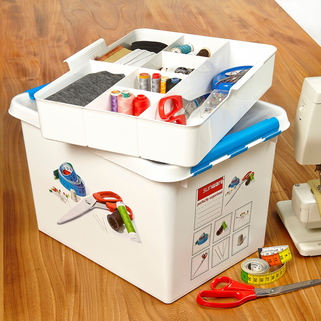 Deze naaibox van Sunware uit de Q-line serie is een praktische opbergoplossing voor naaigerei en handwerkspullen. De box heeft een inhoud van 22 liter en wordt geleverd met een uitneembare tray met vakverdeling. Daarmee kunnen kleine spullen zoals naalden, garen en knopen overzichtelijk worden opgeborgen, terwijl er onderin ruimte is voor grotere items zoals wol of stof.