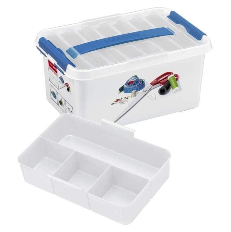 Perfectly Organised Sewing met Sunware's Naaidoos van 6 liter! Zo is de naaibox speciaal ontworpen om alle naaispullen in op te bergen. Deze box is uitgerust met een extra inzetbak waar je bijvoorbeeld klosjes, naalden en garen in kunt opbergen. Stoffen, scharen en andere grotere naaispullen kun je gemakkelijk in het onderste deel van deze box opbergen.
