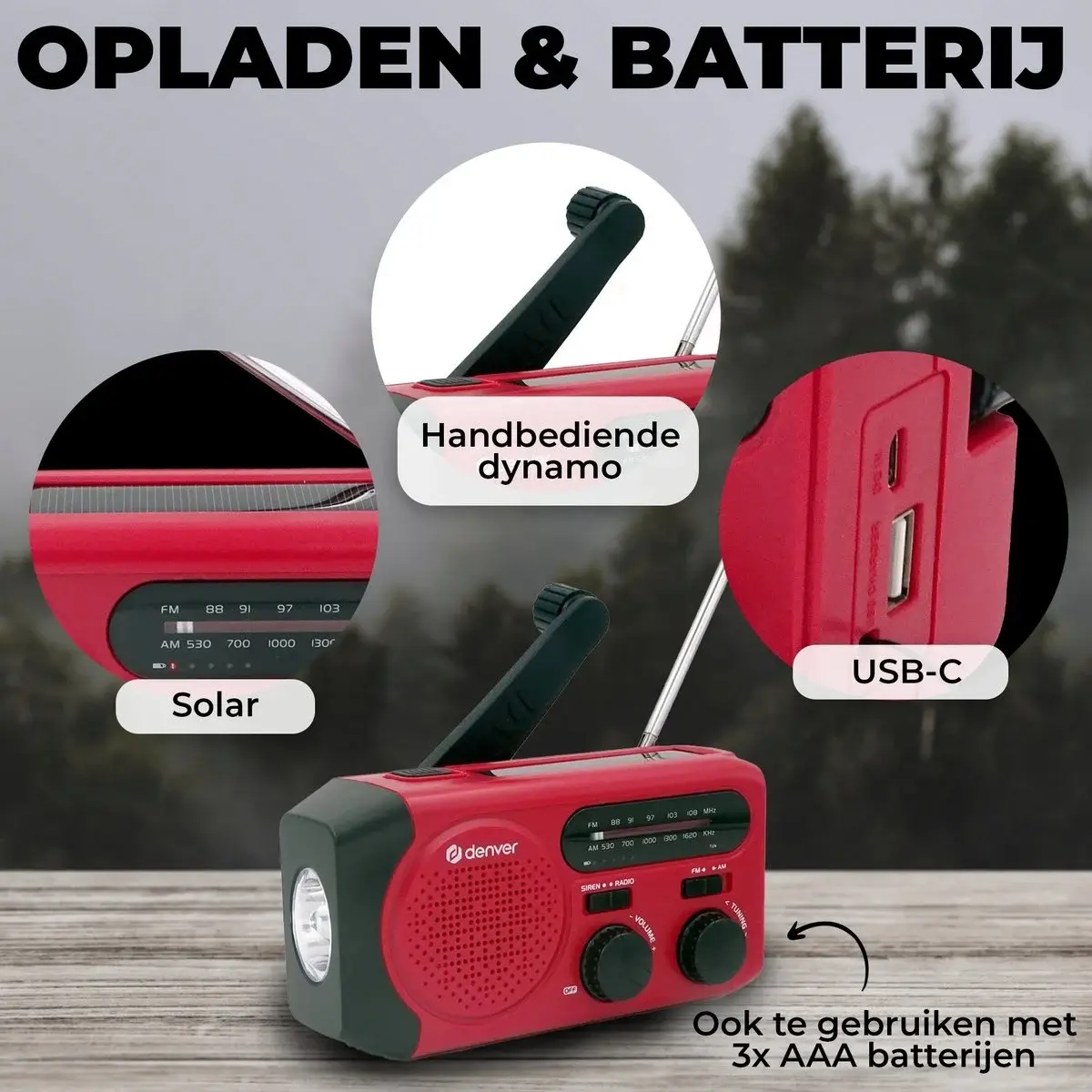 - 4 oplaadmethodes: zonnepaneel, zwengel, USB-C en AAA-batterijen