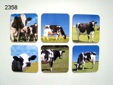 Een setje van 6 onderzetters met als opdruk koeien. Elk onderzettertje heeft een uniek design, met in totaal 6 verschillende koeienillustraties. Leuk voor op tafel én functioneel: beschermt tegen kringen en vlekken van glazen en bekers.