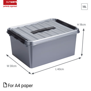 Met deze Q-line opbergbox van 15 liter berg je eenvoudig al je spullen netjes en overzichtelijk op. Of het nu gaat om (A4) papier, boeken, spelletjes of gadgets, deze stevige box biedt een praktische oplossing voor elk rek, kast of bureau. Het deksel is voorzien van een handvat, zodat je de box eenvoudig met één hand kunt oppakken, en de stevige sluitclips zorgen ervoor dat de inhoud stof- en vochtvrij blijft.