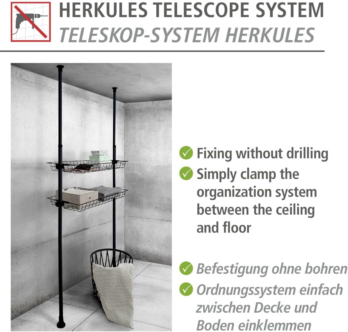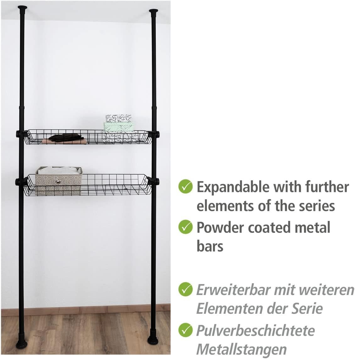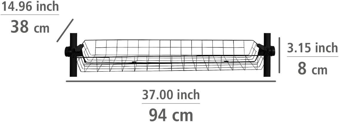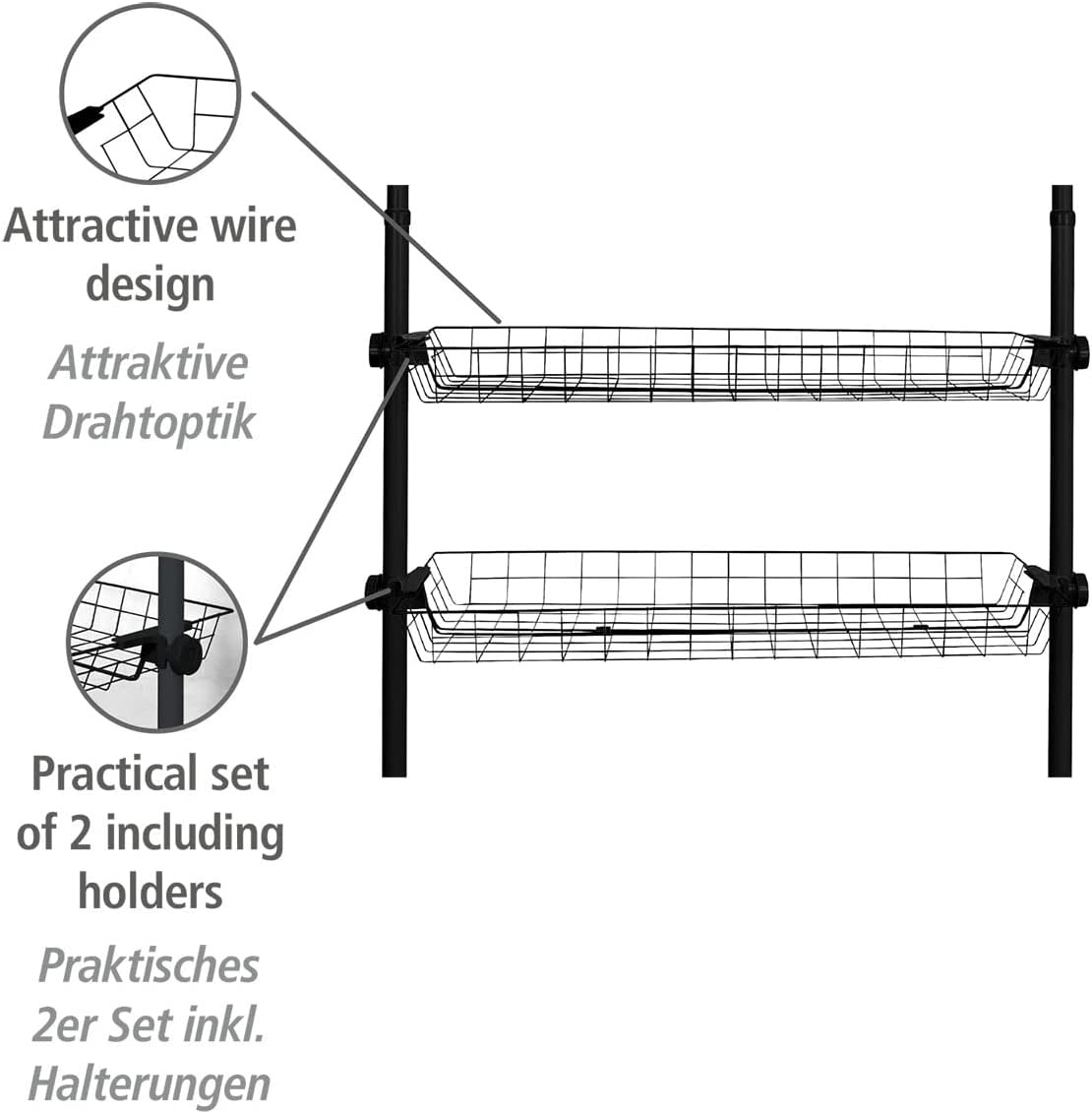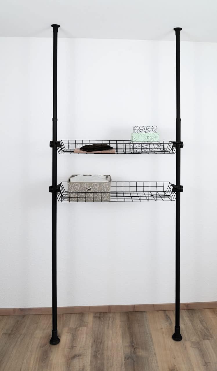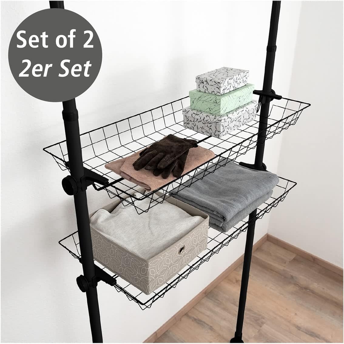 Voeg extra opbergruimte toe aan je telescoopsysteem Hercules van WENKO met deze handige set van twee draadmanden. Perfect voor het netjes opbergen van kleding, accessoires, sokken of riemen, zodat je walk-in closet of garderobe overzichtelijk blijft. De manden zijn eenvoudig te monteren tussen de verticale hoofdstangen van het Hercules-systeem en passen naadloos bij de overige accessoires.