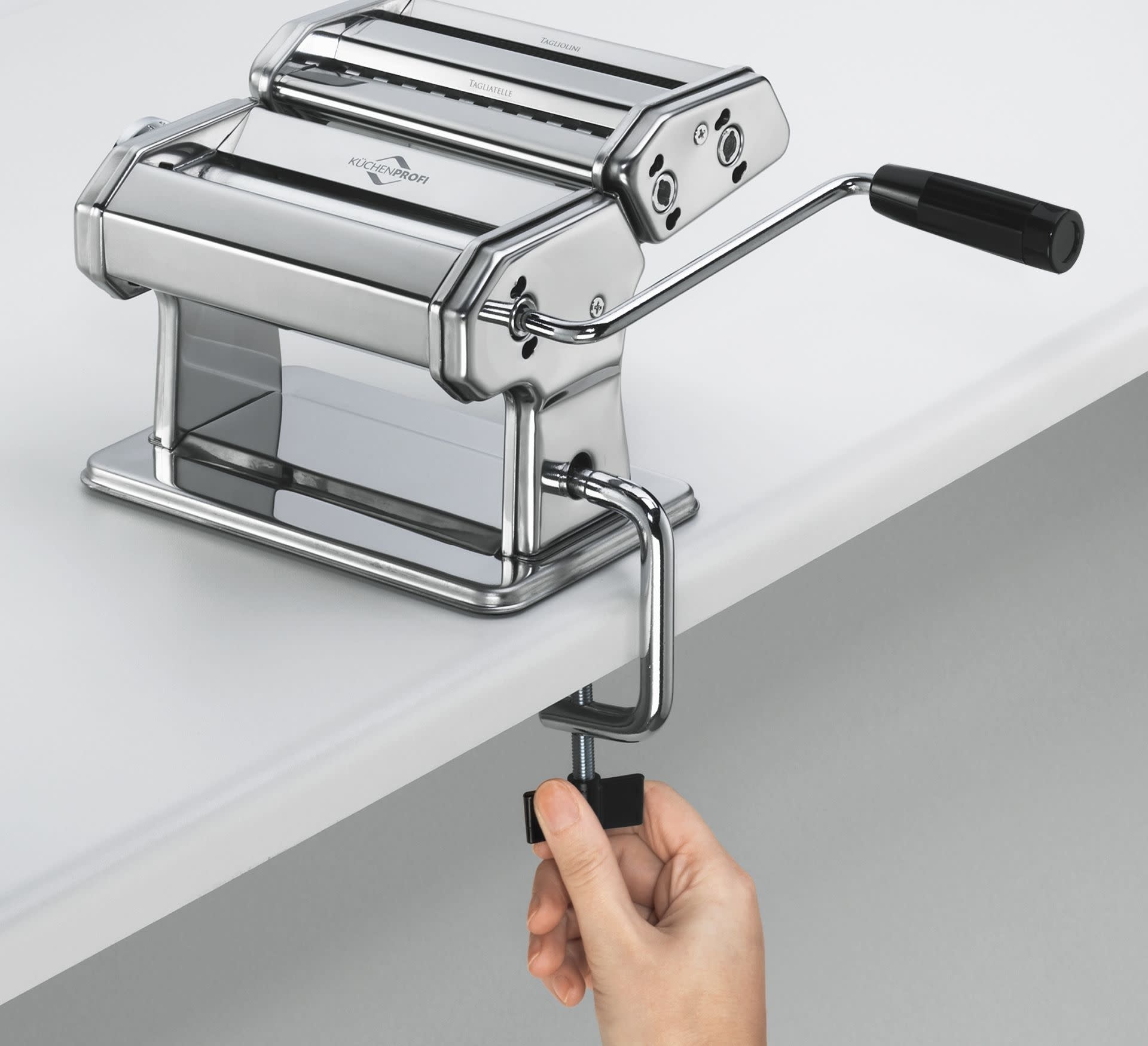 De extra grote tafelklem zorgt voor een stabiele bevestiging op werkbladen tot 6,5 cm dik, zodat je veilig kunt werken. Voor wie zijn pastamogelijkheden wil uitbreiden, zijn een motor en extra opzetstukken apart verkrijgbaar.