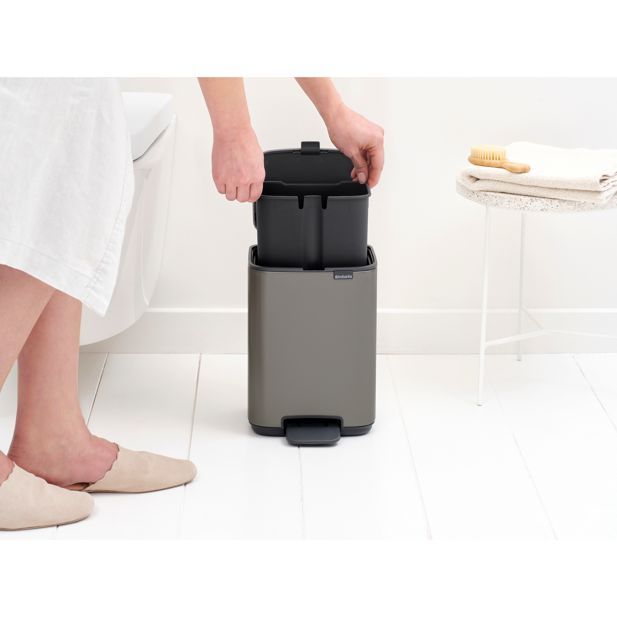 De uitneembare binnenemmer van 100% gerecycled kunststof maakt schoonmaken extra eenvoudig. Wil je de afvalzak verwisselen? Zet het deksel in de open stand en je bent zo klaar. Dankzij de geïntegreerde greep verplaats je de pedaalemmer zonder moeite. En met de antislip onderkant blijft alles stevig op zijn plek zonder krassen.